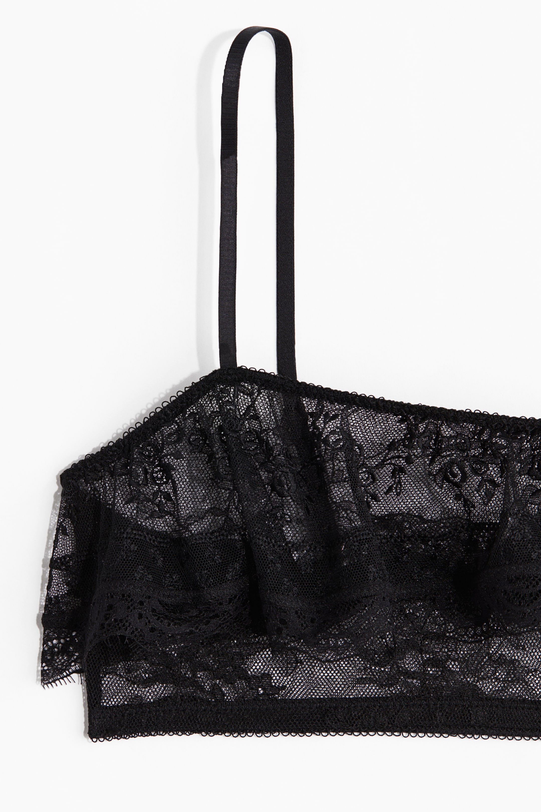Soft, non-wired bra in sheer lace detailed with a wide frill trim all around. Adjustable shoulder straps and unlined cups that give the bust a natural shape and provide light support. No fasteners.