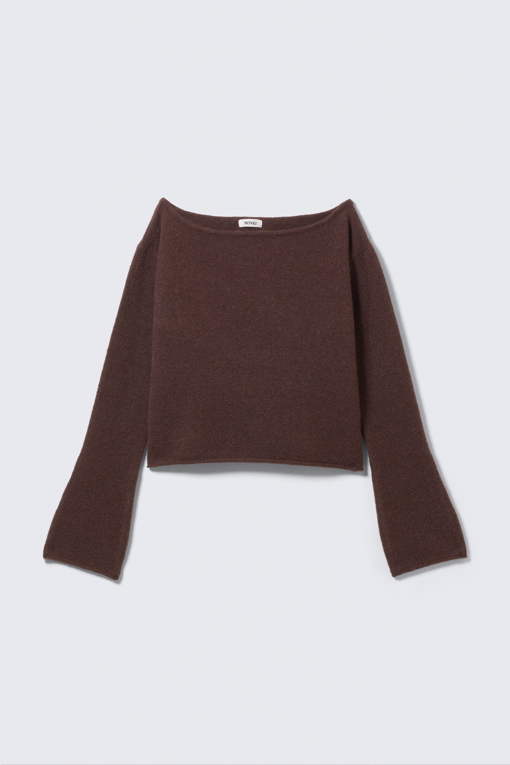 A loose fit sweater with a wide, folded rib detail at the neck. Features rolled edges at the sleeves and hem. Made from recycled polyester.