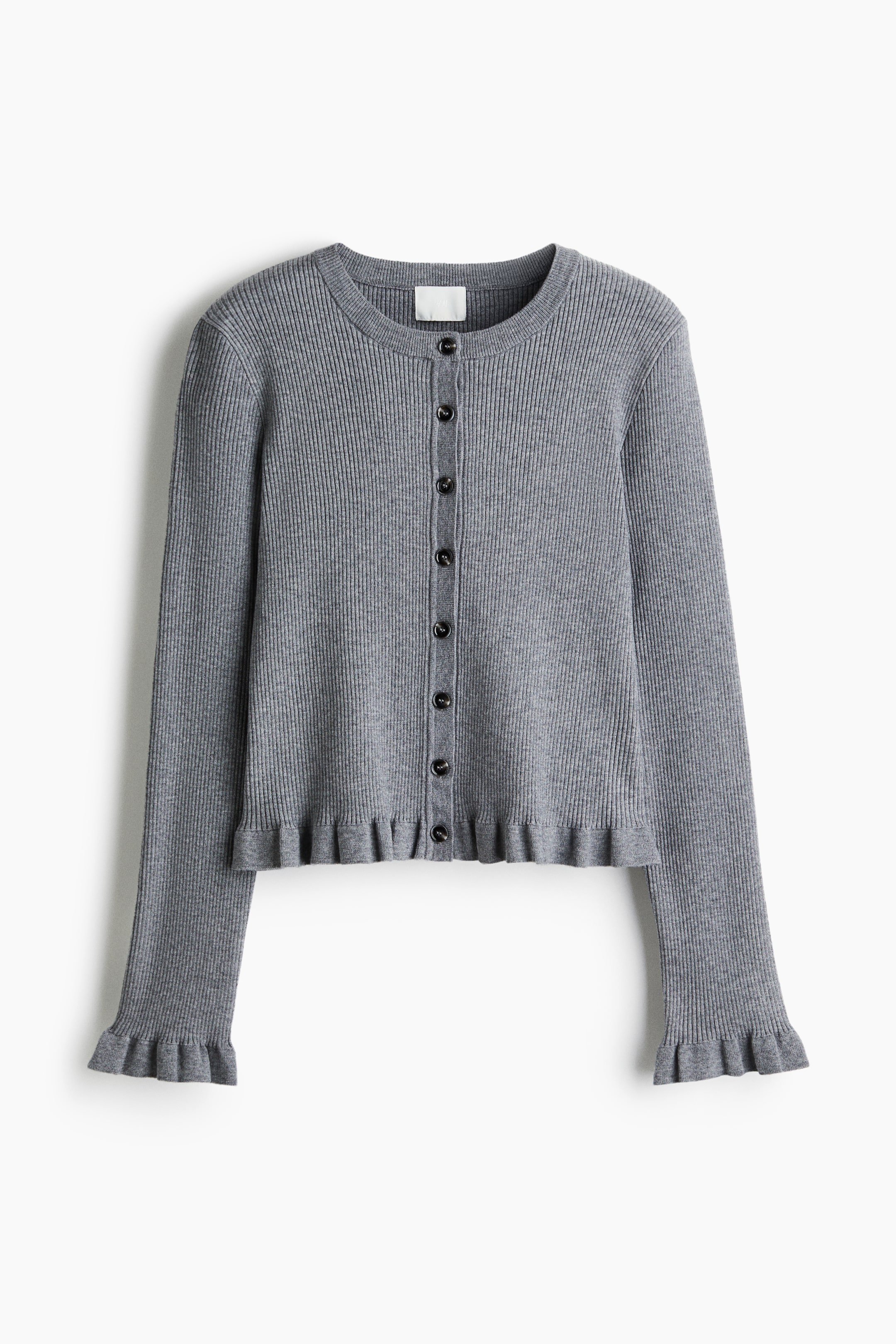 Short, fitted cardigan in a soft rib knit with a round neckline and buttons down the front. Long sleeves and a frilled edge at the cuffs and hem.
