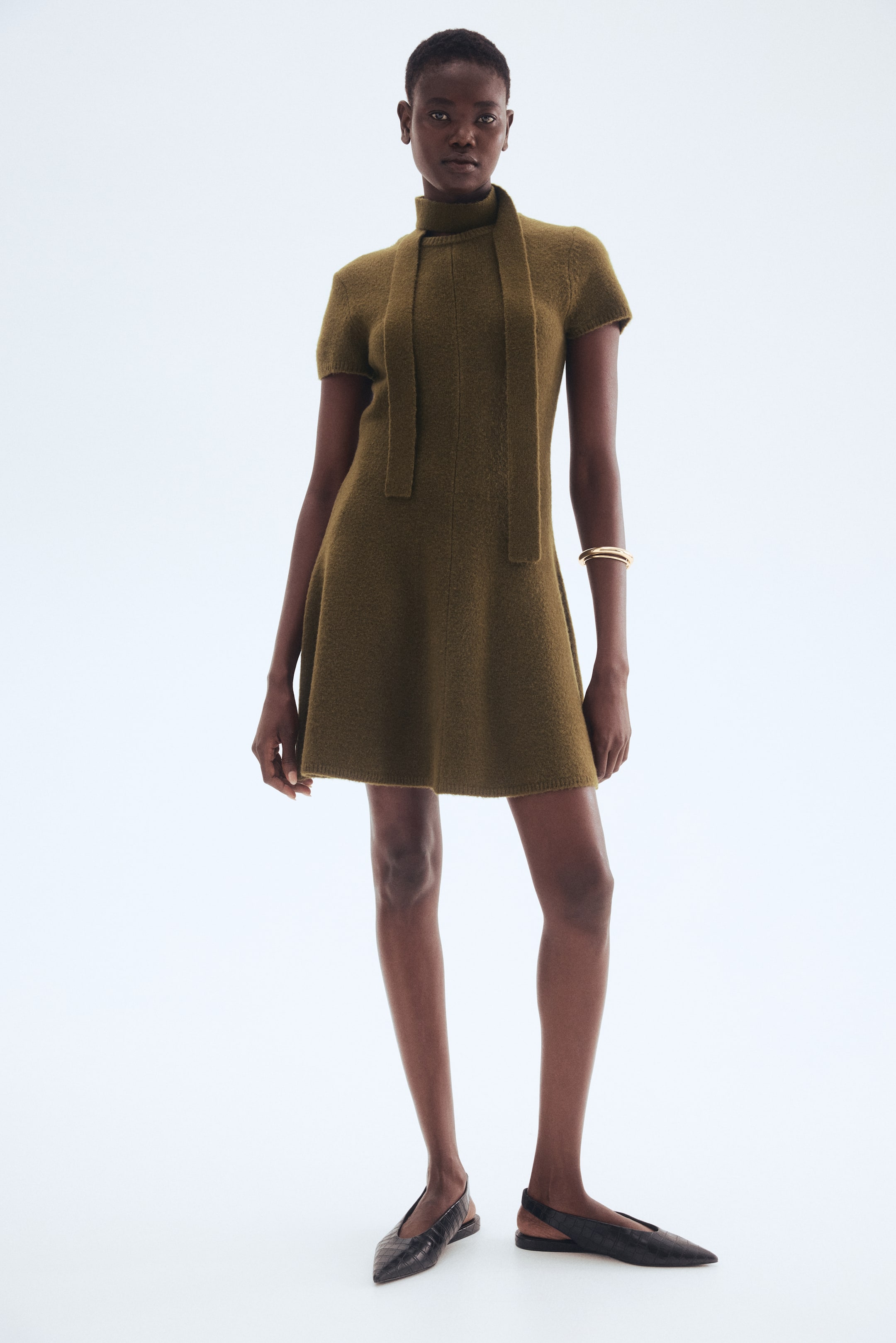 Short, fitted dress in a soft knit with a round neckline and a long, detachable scarf for various styling options. Short sleeves and a flared skirt.
