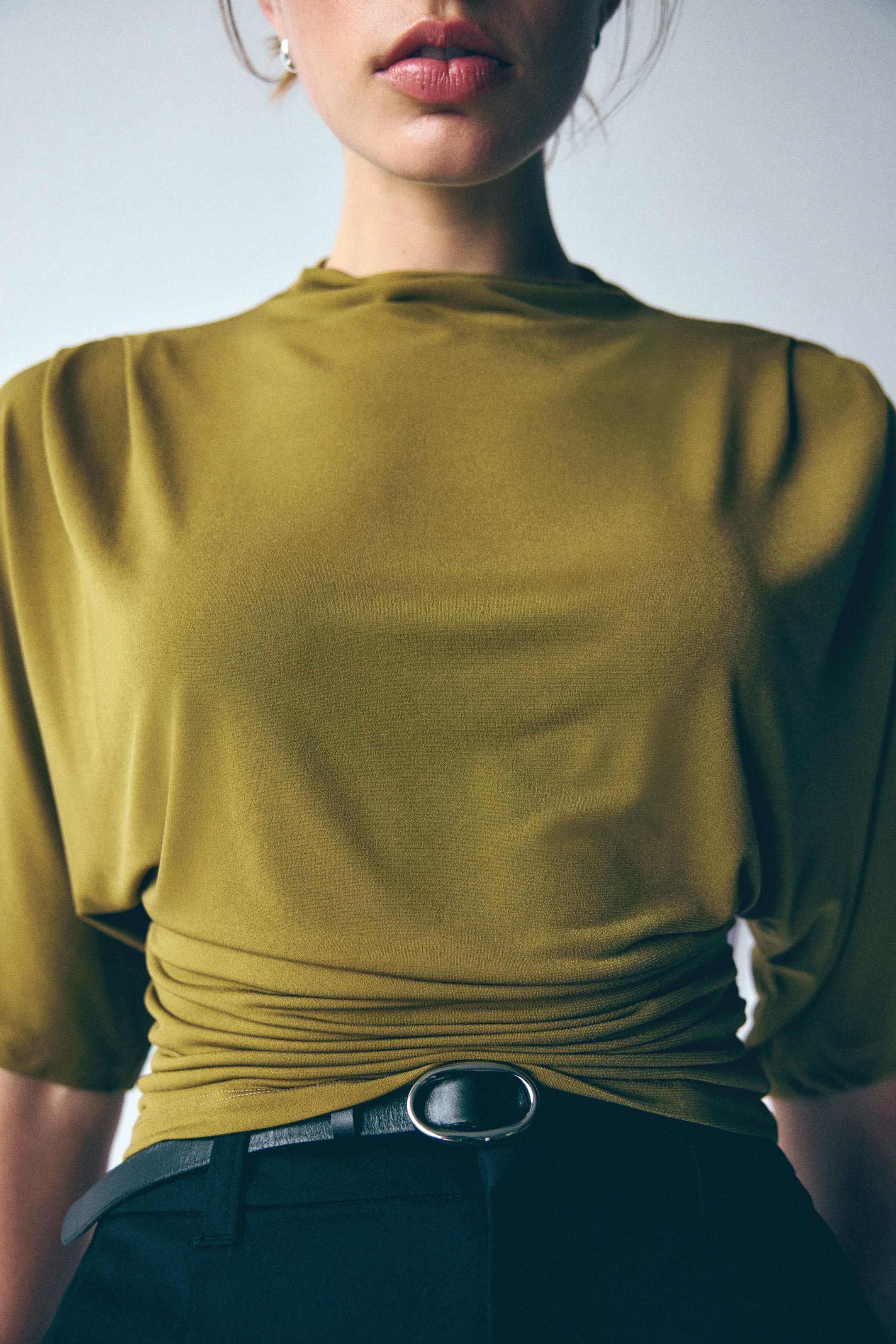 Top in stretch jersey with a turtle neck and elbow-length sleeves. Gathers on the shoulders and at the sides creating a draped effect.