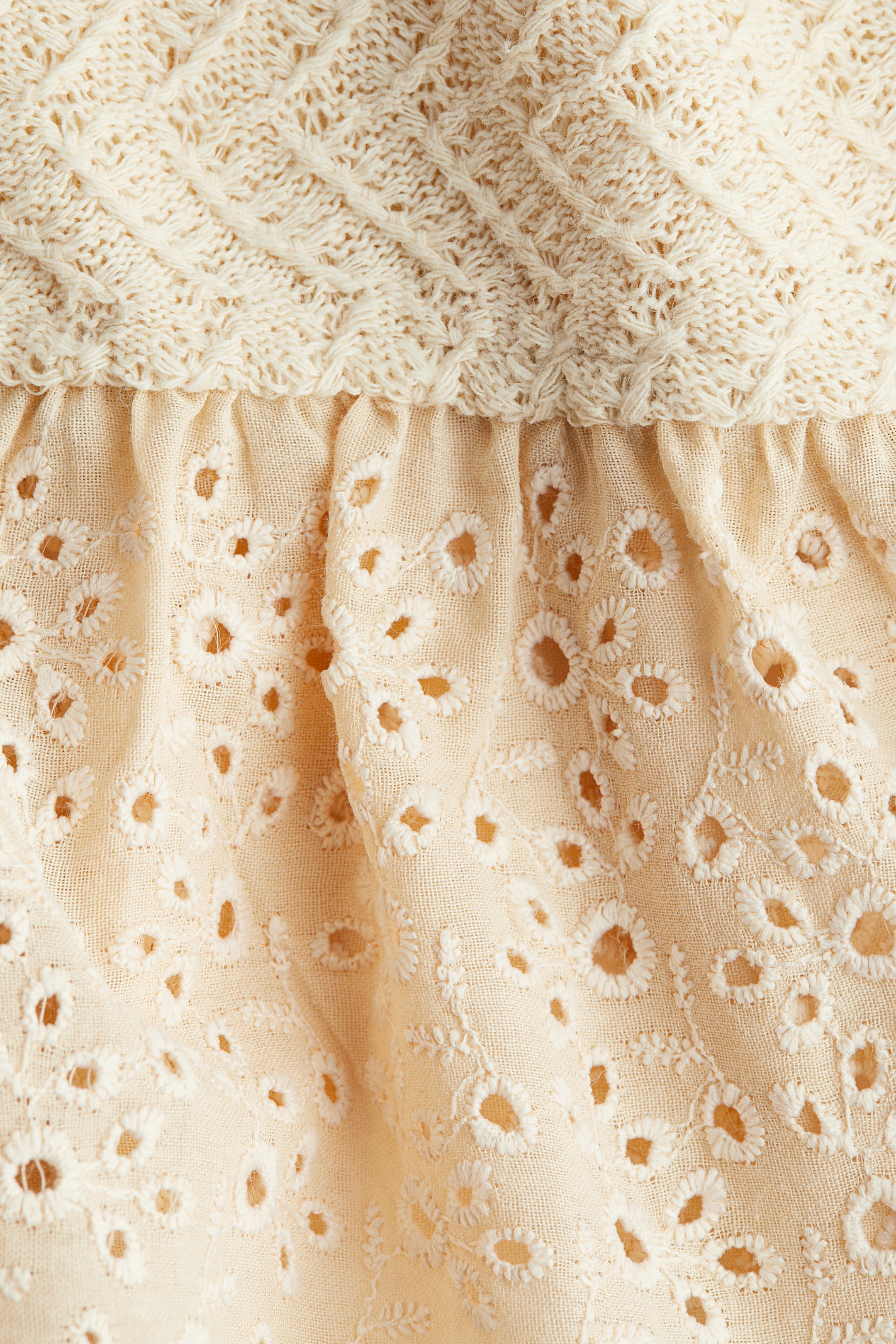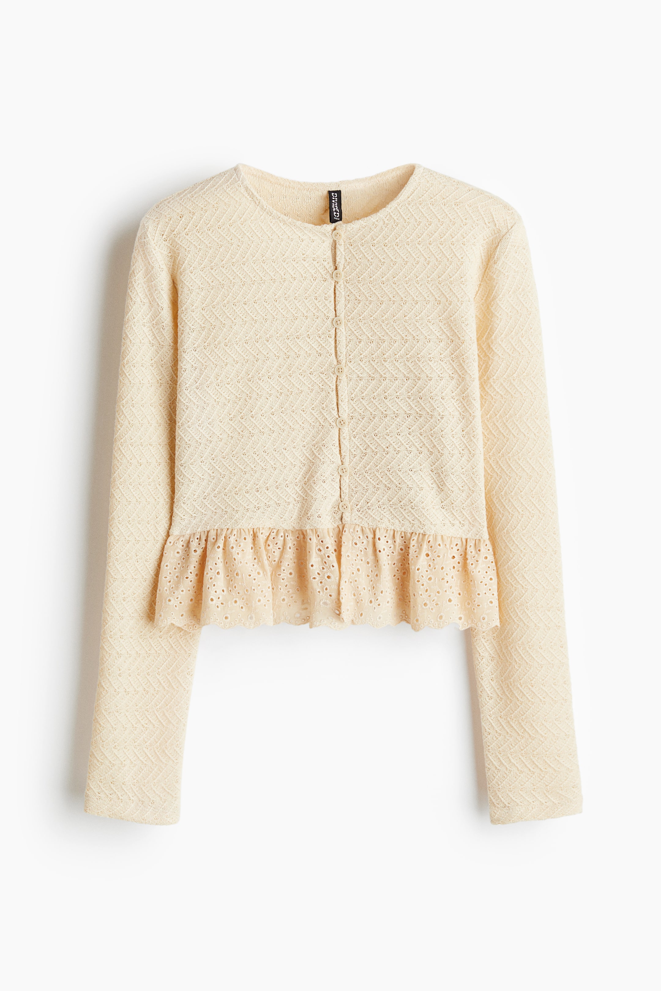 Fitted cardigan in a fine, textured knit featuring a flared peplum in a cotton weave detailed with broderie anglaise. Round neckline, buttons down the front and long sleeves.