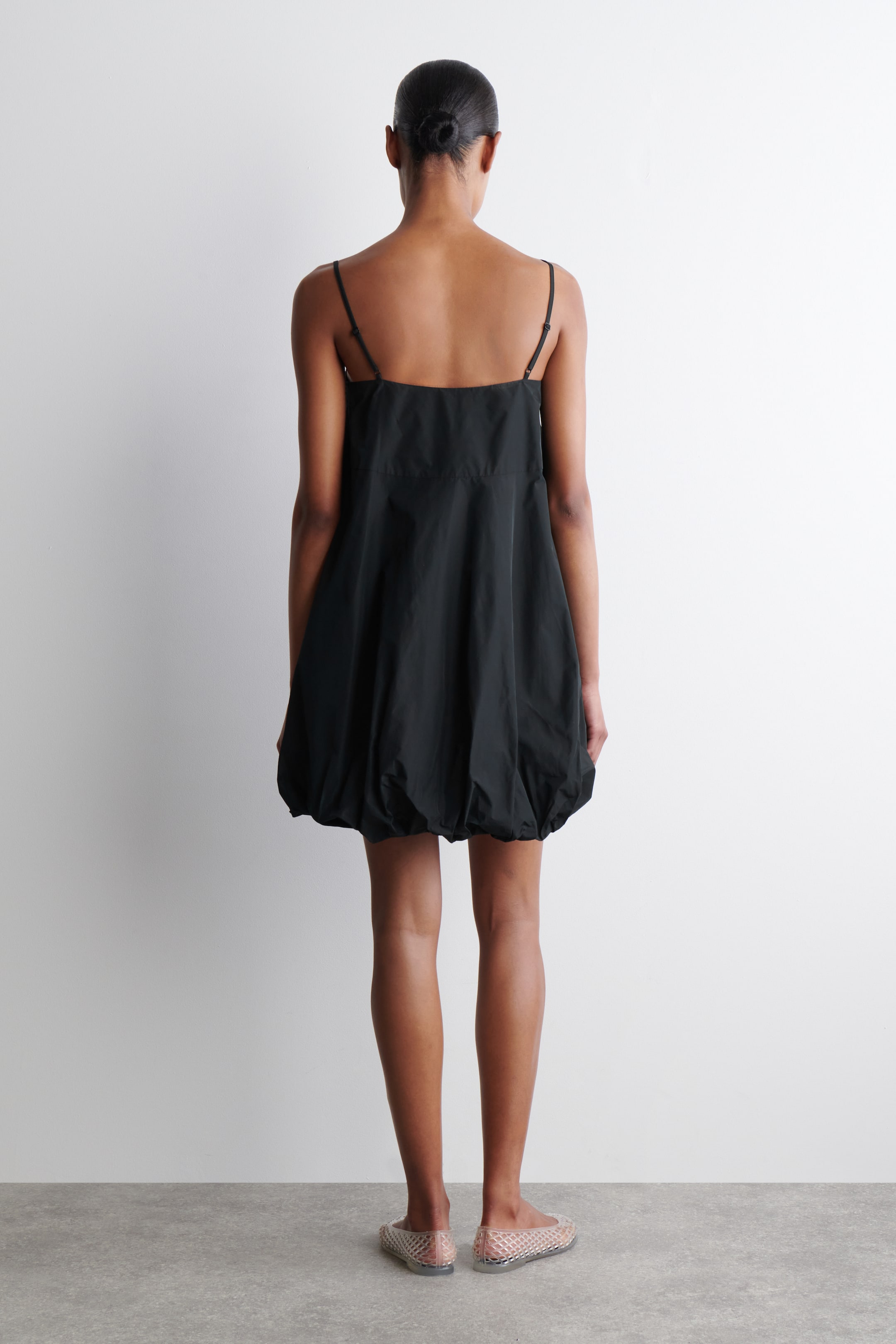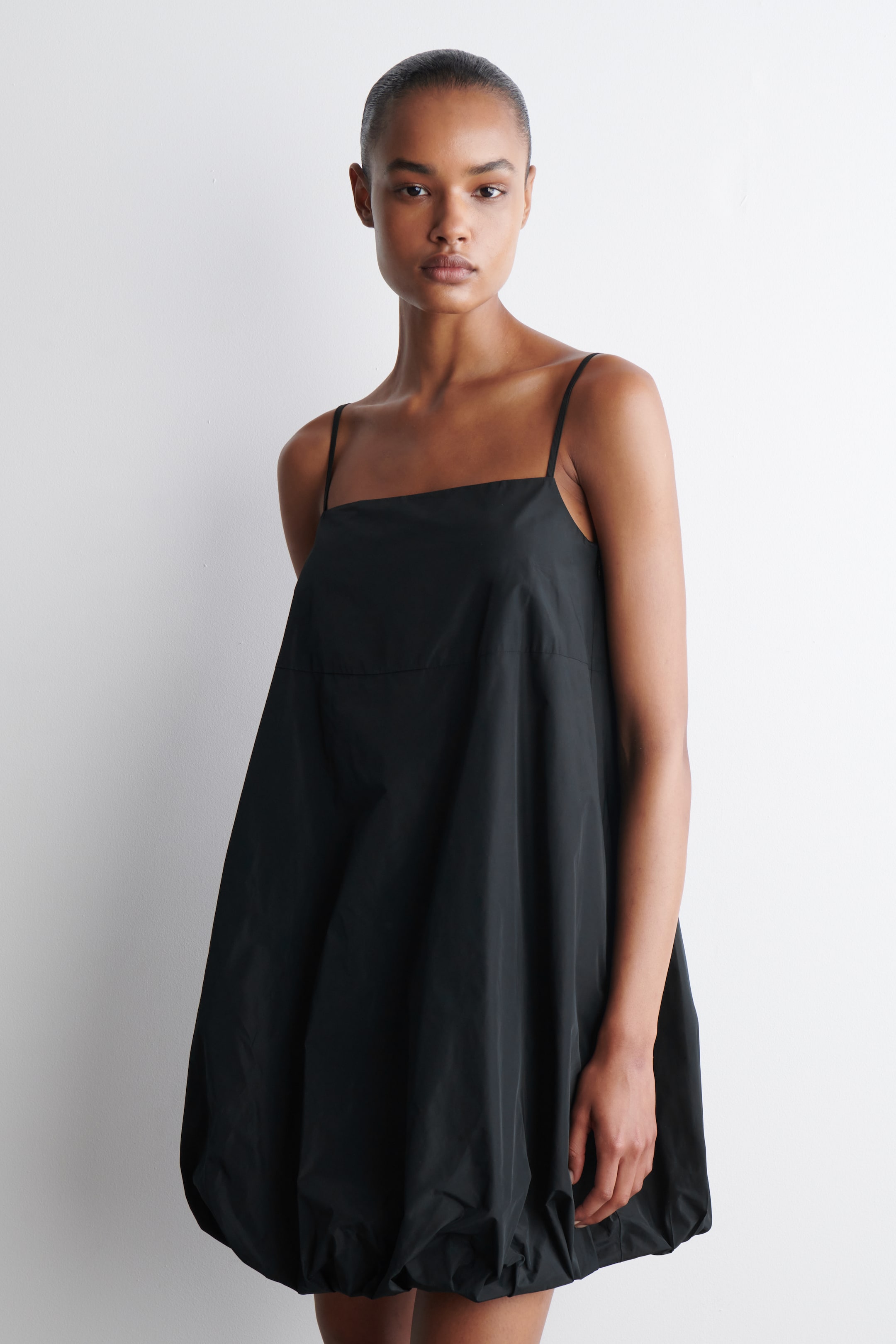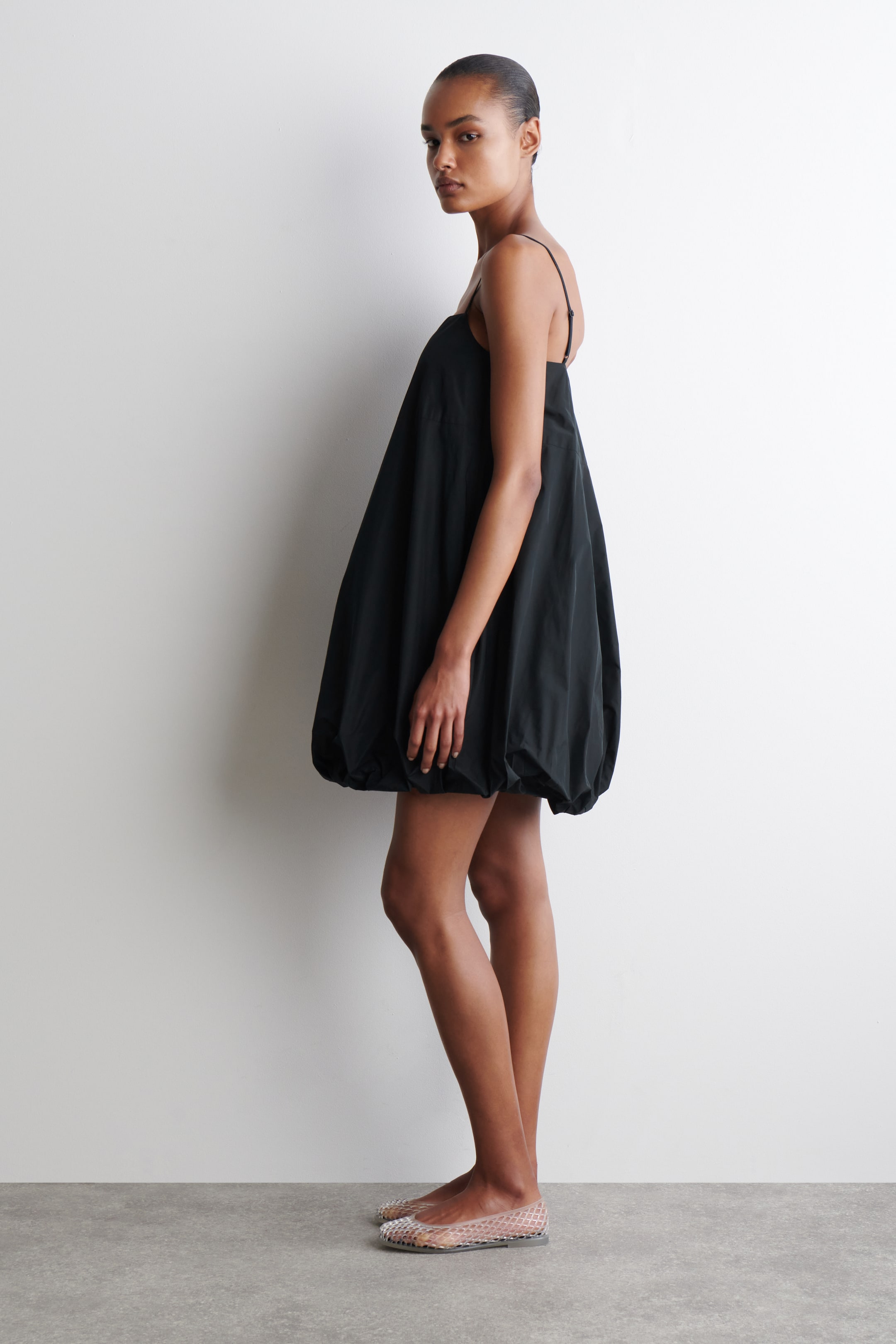 The bubble-hem dress is the silhouette of the season. This mini piece is cut in a sculptural shape and features a squared neckline framed by slender shoulder straps for a modern refinement. Style it with sandals or mules. Regular fit Recycled polyester is polyester made from PET bottles or end-of-life textile waste. The PET bottles or textile waste is mechanically recycled and processed into new yarn Shell: 100% Polyester. Lining: 100% Cotton. Excluding trims / Machine wash Back length of size EU 36 is 61.3cm / Model wears a size EU 36