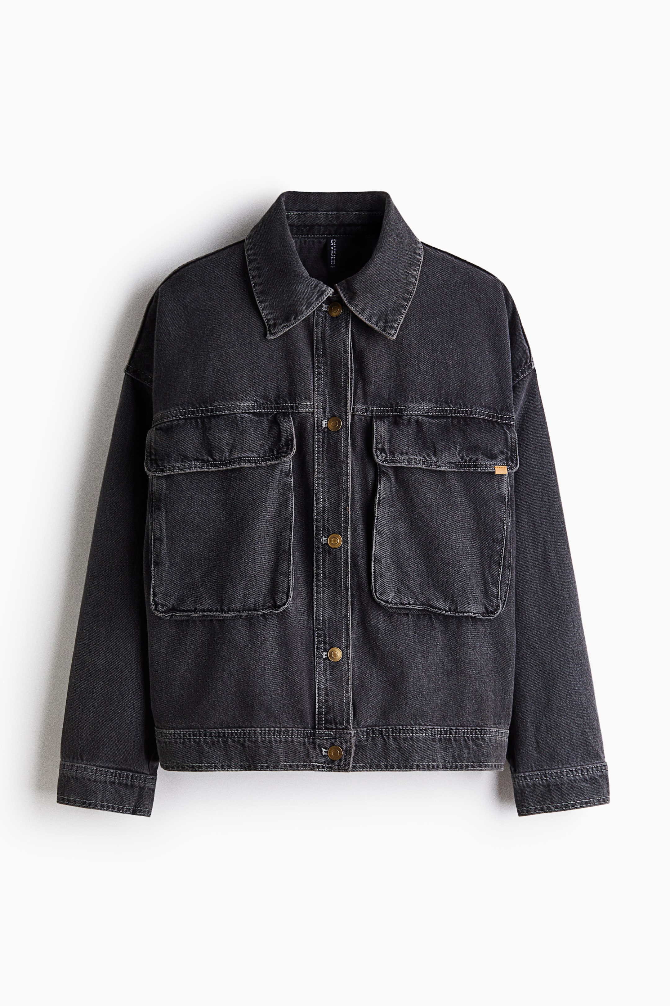 Oversized jacket in rigid cotton denim with a collar, buttons down the front and large bellows pockets at the front with a flap and concealed press-stud. Yoke at the front and back, pleats at the back and a tab with adjustable buttoning at the sides of the hem. Dropped shoulders, long sleeves and buttoned cuffs.