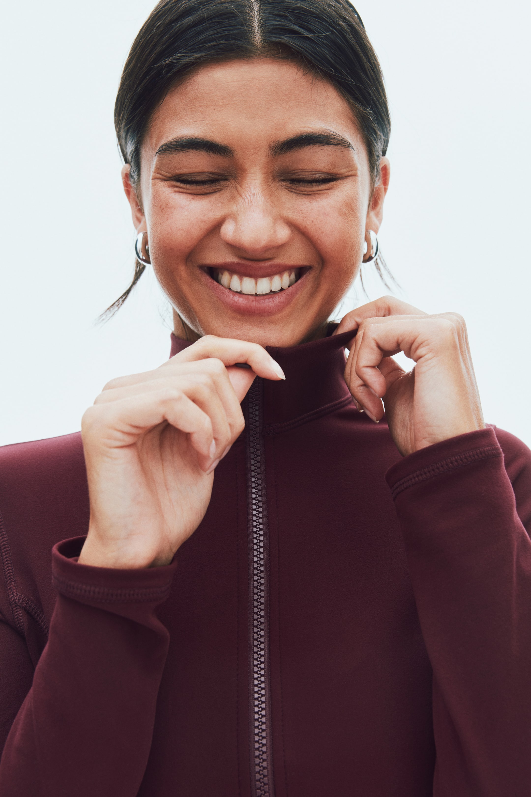 Fitted top in soft, stretch jersey with flatlock seams at the front and back. Stand-up collar, zip down the front and long sleeves.