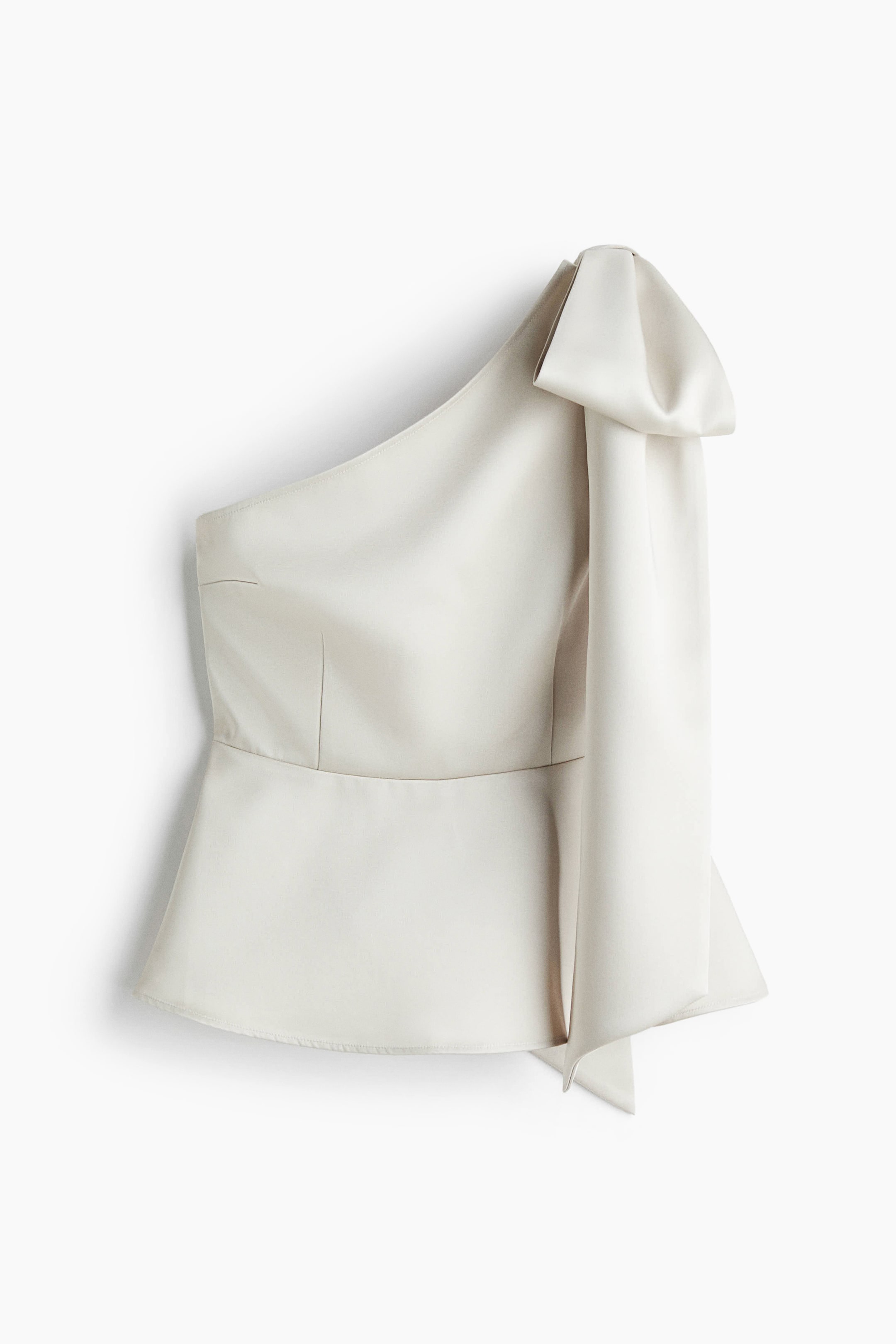 Fitted one-shoulder top in woven fabric with an asymmetric neckline and a large bow on one shoulder. Concealed zip and hook-and-eye fastener at one side, shaping darts at the waist and a flared peplum.