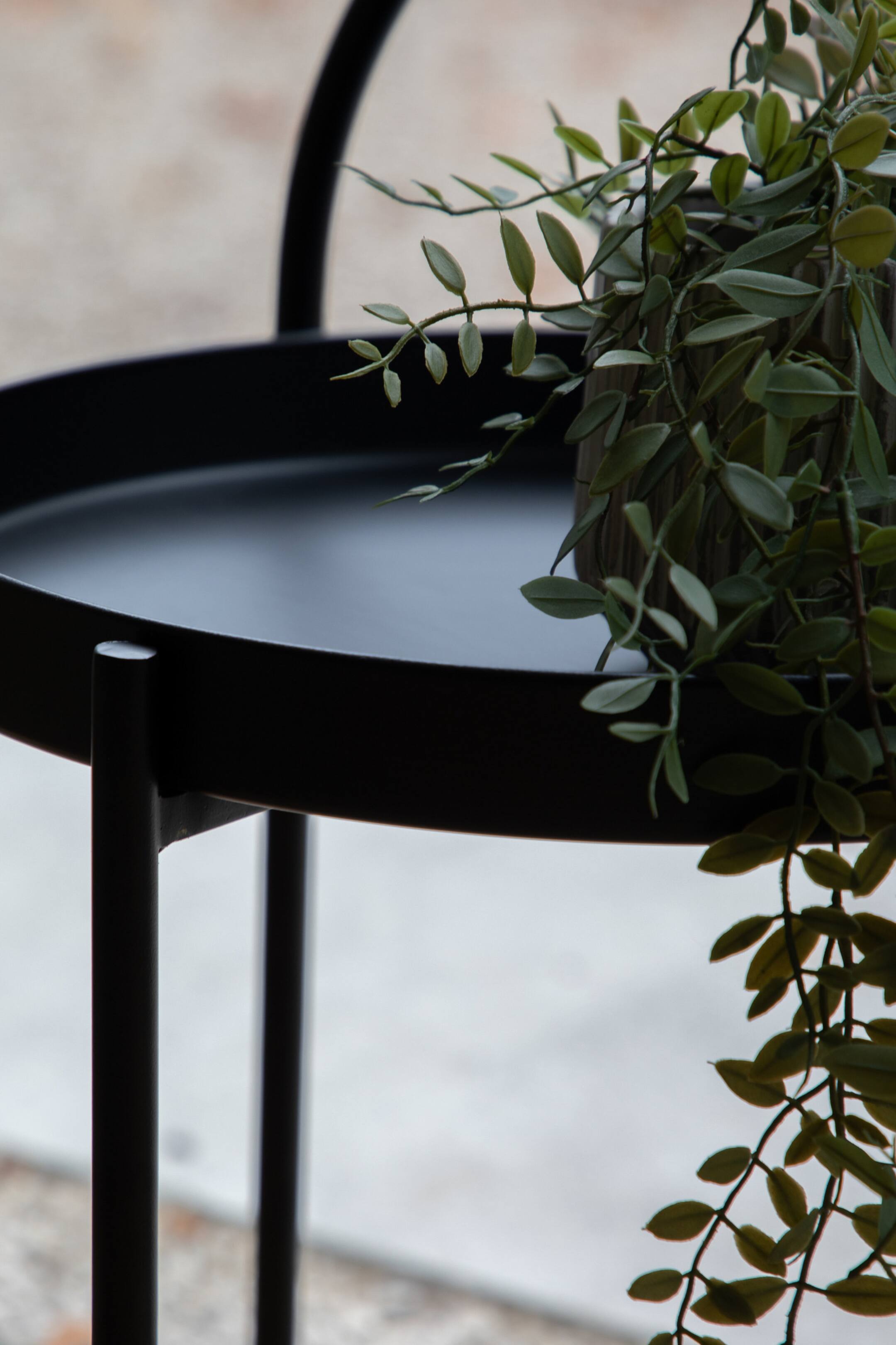 The stylish design of this unusual side table features a tray-style top, which lifts off for added practicality, and a continuation of one section of the base, up and over the table to create a ‘handle’ effect. Both the tray top and base are made from metal with a painted finish. Dimensions: W400mmxD400mmxH660mm