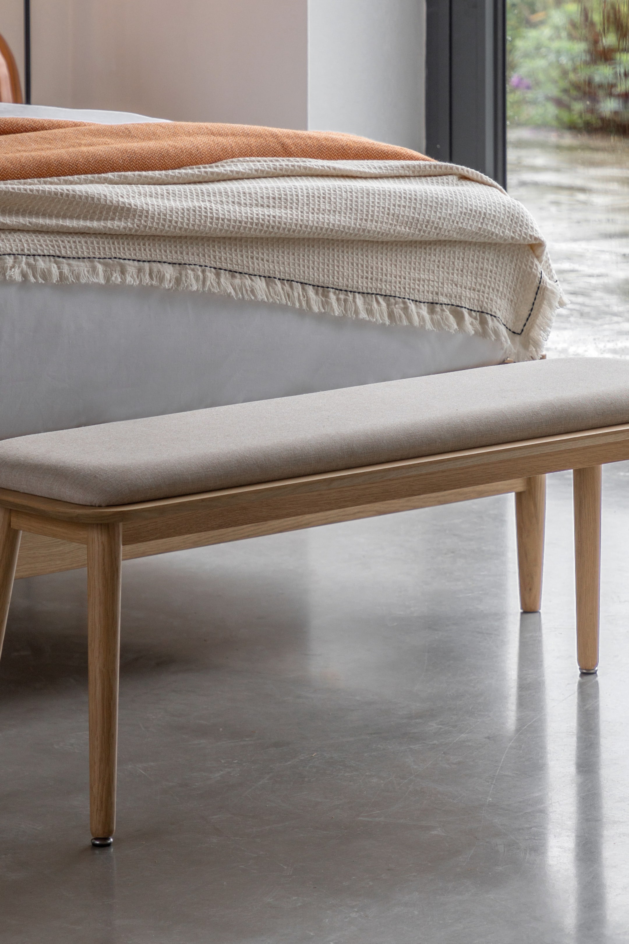 This versatile bench can be used in a variety of settings, from the foot of a bed to the hallway. Its oak frame is both durable and aesthetically pleasing, with a neutral fabric to accompany its contemporary design and enhance comfort. The natural finish complements a variety of interior styles.Dimensions: W1240mmxD380mmxH450mm