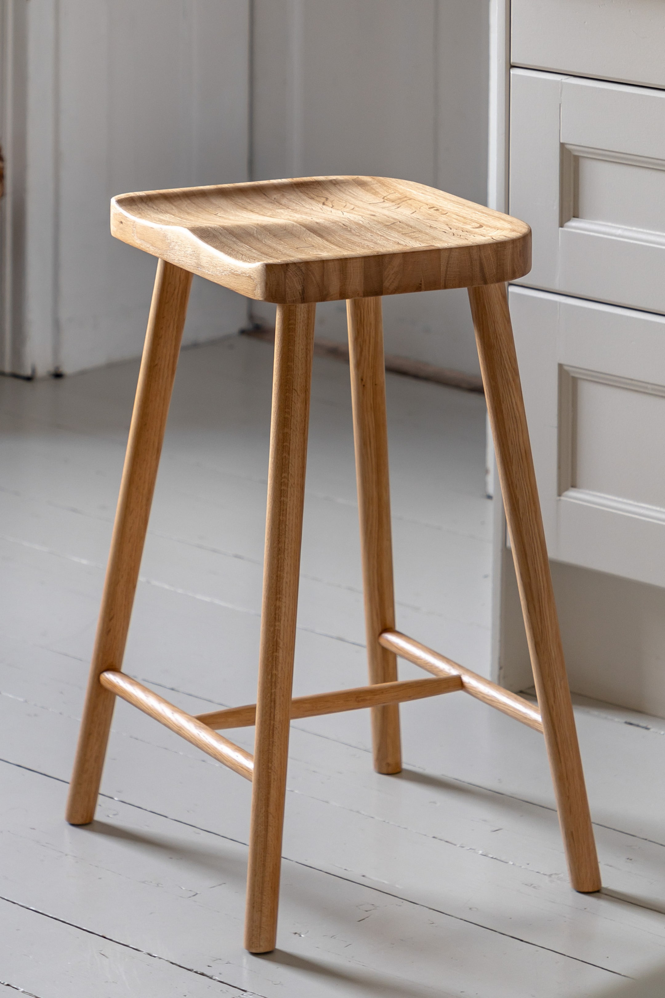 In stunning natural wood, this bar stool is elegantly simple. With a moulded saddle seat and slim tapered legs, it is uncomplicated and chic, perfectly suited to a variety of interior styles.Dimensions: W410mmxD375mmxH675mm