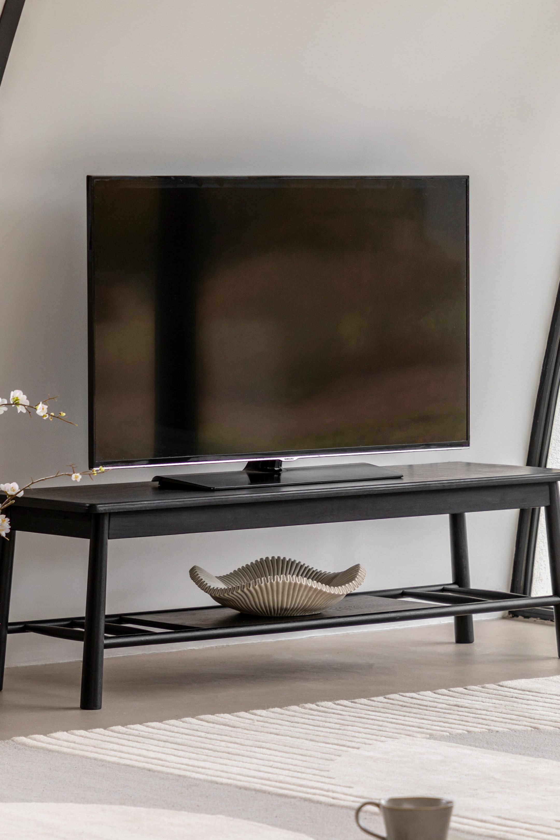 Made from the finest solid oak and veneers this low media unit combines style and practicality. The black oak veneered top, solid oak underframe and low shelf offer plenty of storage for all your media needs while the tapered legs and spindle details add the essence of Nordic style.Dimensions: W1400mmxD420mmxH425mm