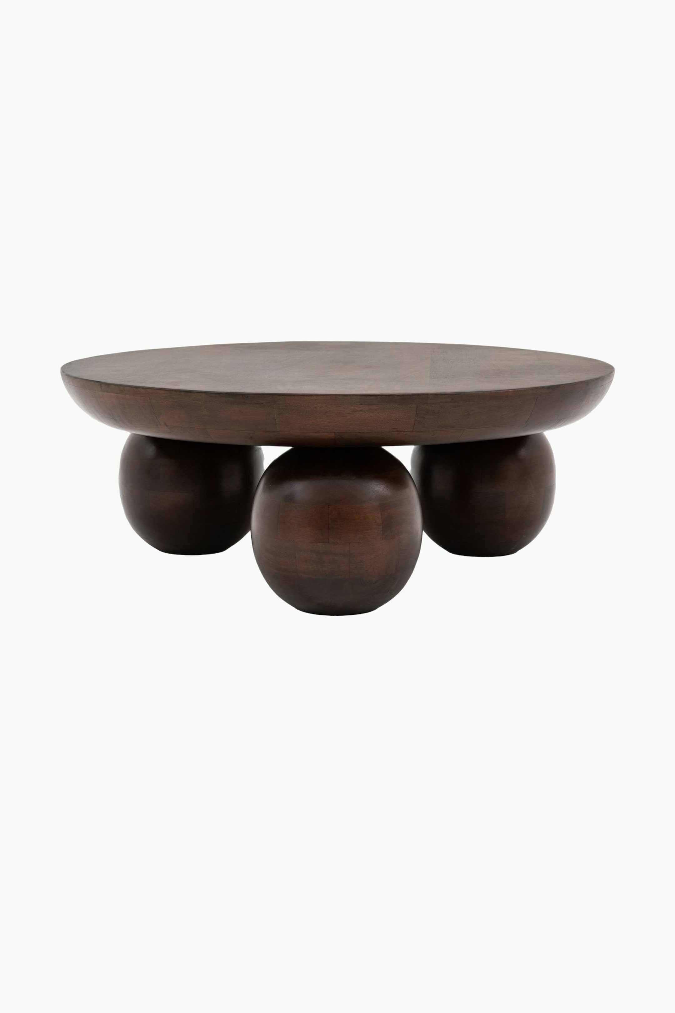 Offering a dramatic retro look, this stunning coffee table is crafted from mango wood solids which have a rich deep finish. The chunky top gently curves away on the underside, with turned ball feet completing the look.Dimensions: W900mmxD900mmxH340mm