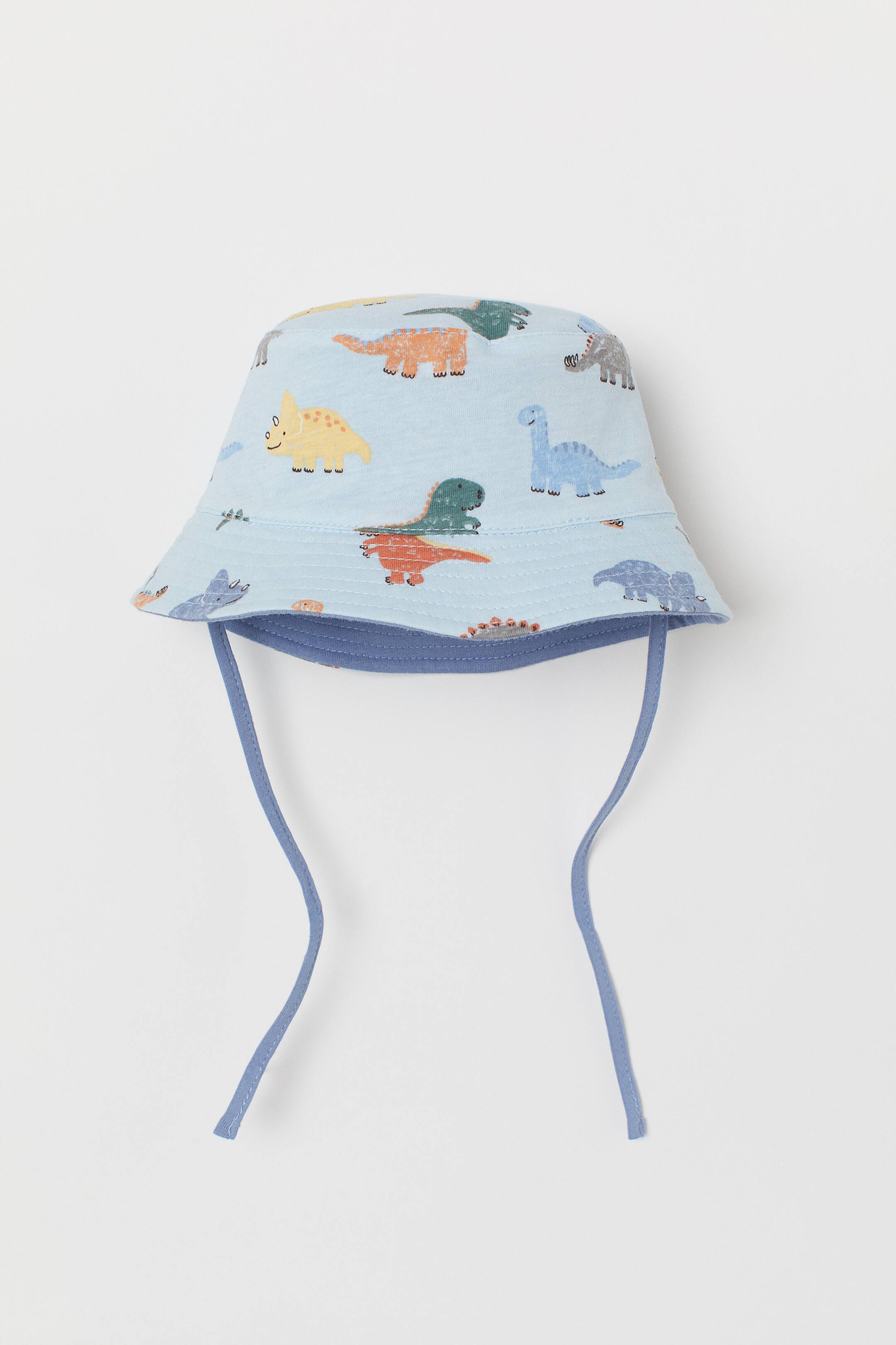 Reversible sun hat in soft cotton jersey with one patterned side and narrow ties at the sides. Width of brim approx. 4 cm.