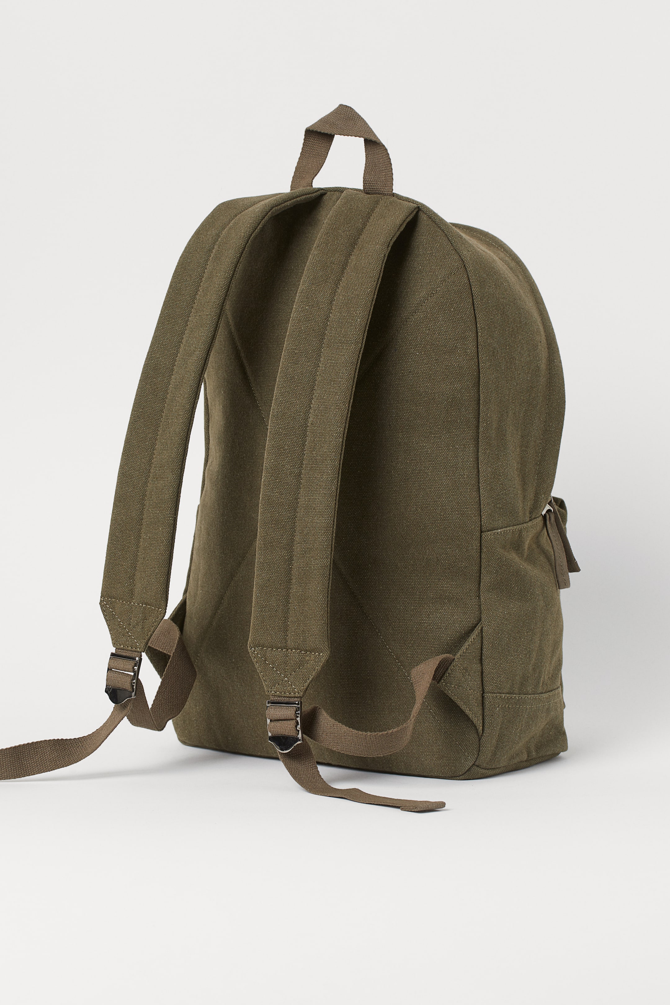 Cotton canvas backpack with a handle, adjustable, padded shoulder straps and a concealed zip at the top. Outer compartment with a concealed zip and text print, one padded inner compartment, a padded back plate and padded base. Partly lined. Depth 14.5 cm. Width 30 cm. Height 46 cm.