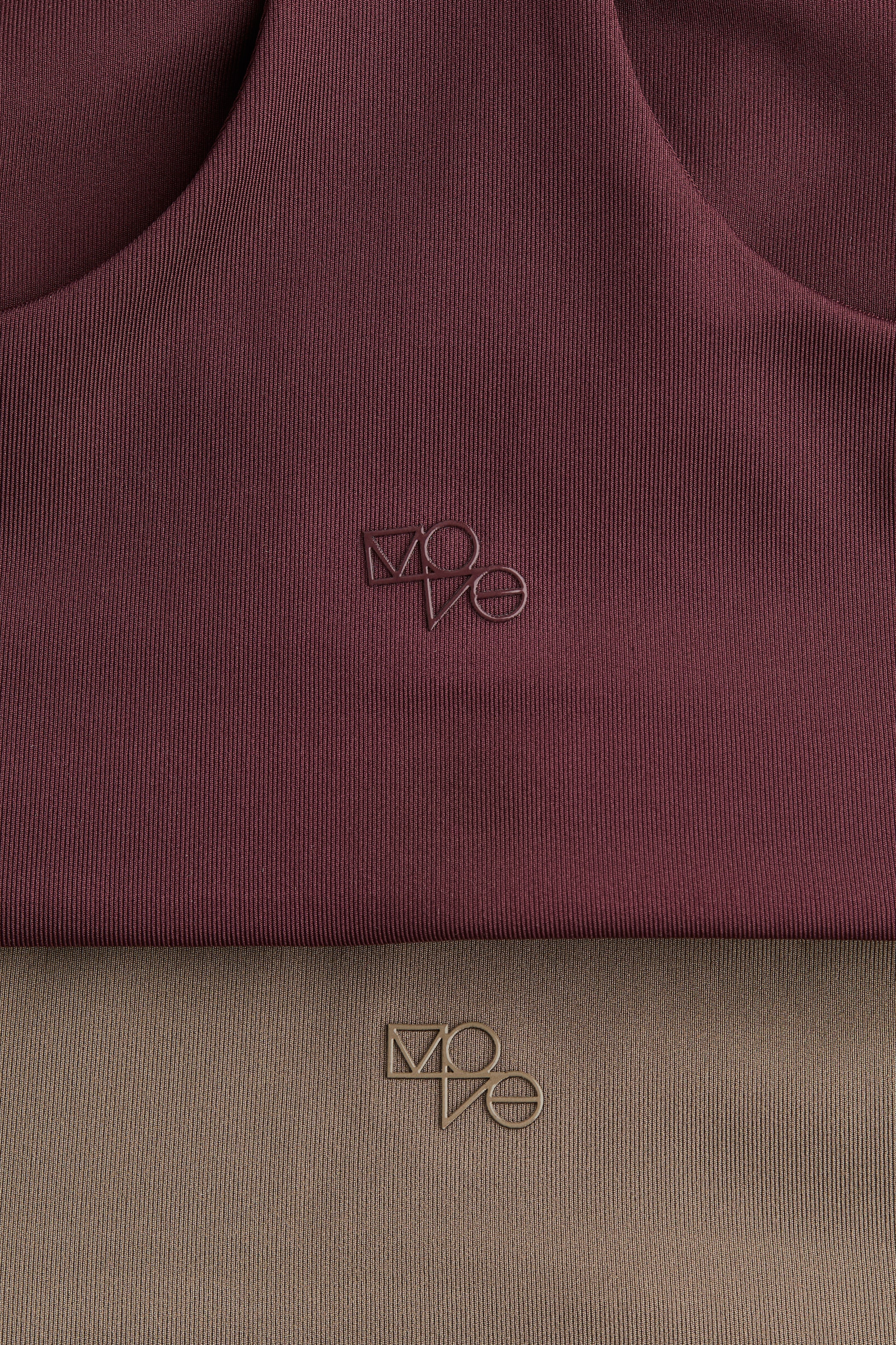 Sports bras with medium support suitable for moderate-intensity workouts. Fabric with a fast-drying function designed to help keep you dry and cool while exercising. Wide shoulder straps and a racer back.