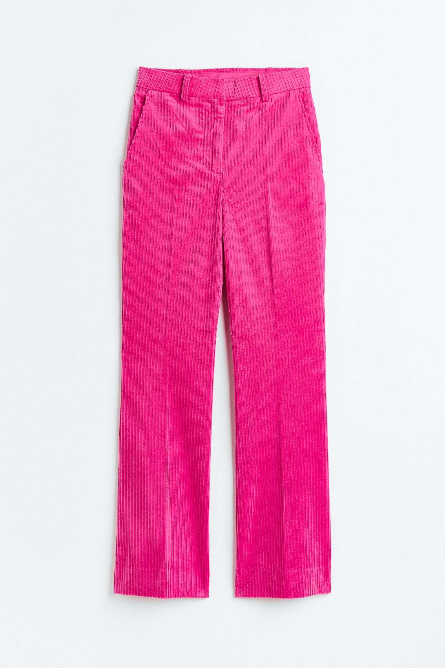 Trousers in cotton corduroy with a high waist, concealed hook-and-eye fastening and zip fly. Diagonal side pockets, fake welt back pockets and long, bootcut legs.