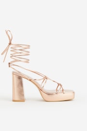 Platform sandals with a metallic finish. Covered block heels, square toes and narrow, knot-detail foot straps. Long, narrow straps that tie around the ankle. Platform 2.5 cm. Heel 10 cm.