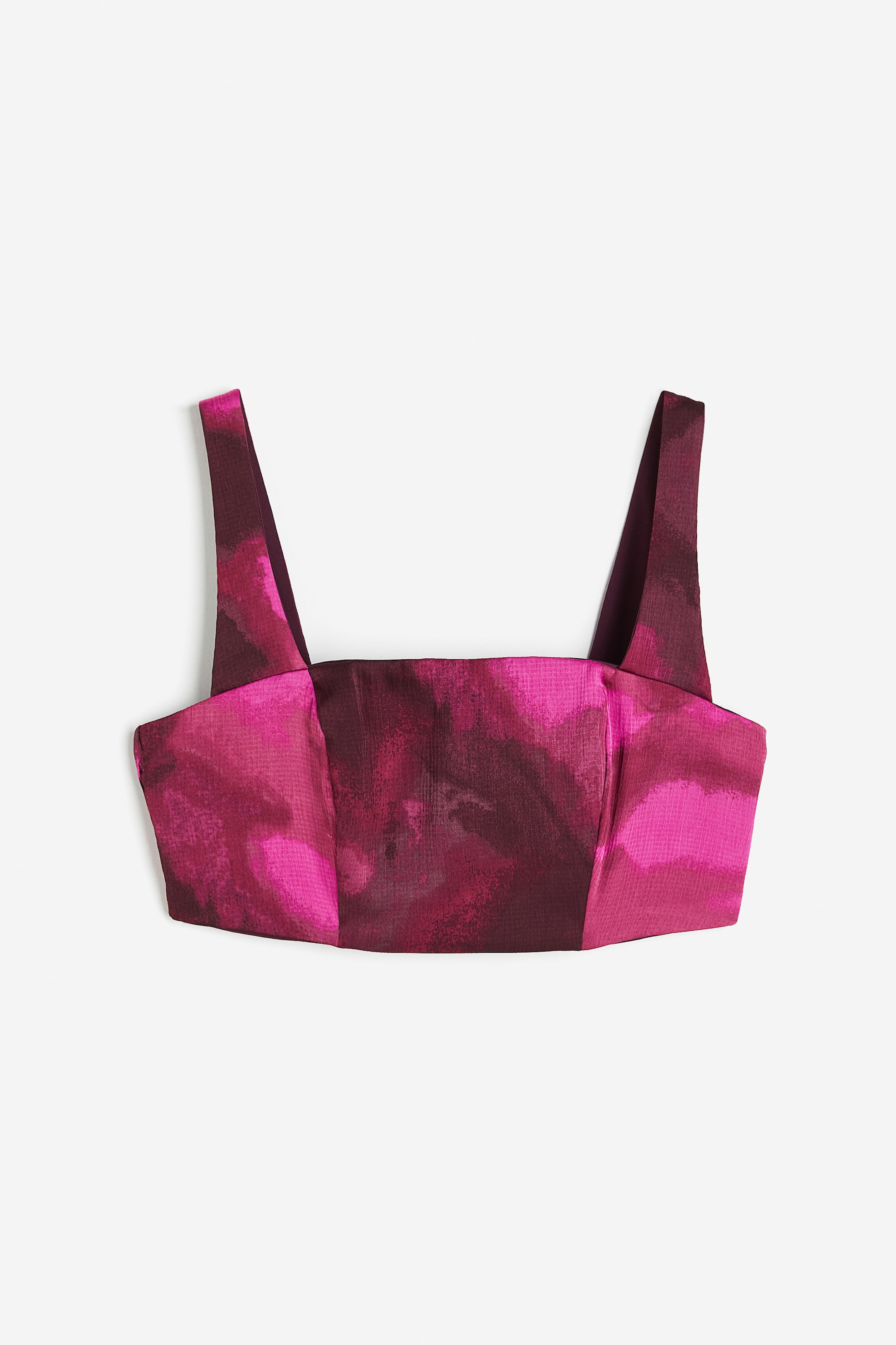 Crop top in woven fabric with a square neckline, wide shoulder straps, boning at the front and concealed silicone tape at the top. Covered elastication and a concealed hook-and-eye fastening at the back. Lined.