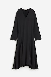 Calf-length dress in softly draping satin made from a lyocell blend. Deep V-neckline, dropped shoulders, long sleeves and wide cuffs with a slit. Flared skirt with V-shaped insets for added volume. Unlined.