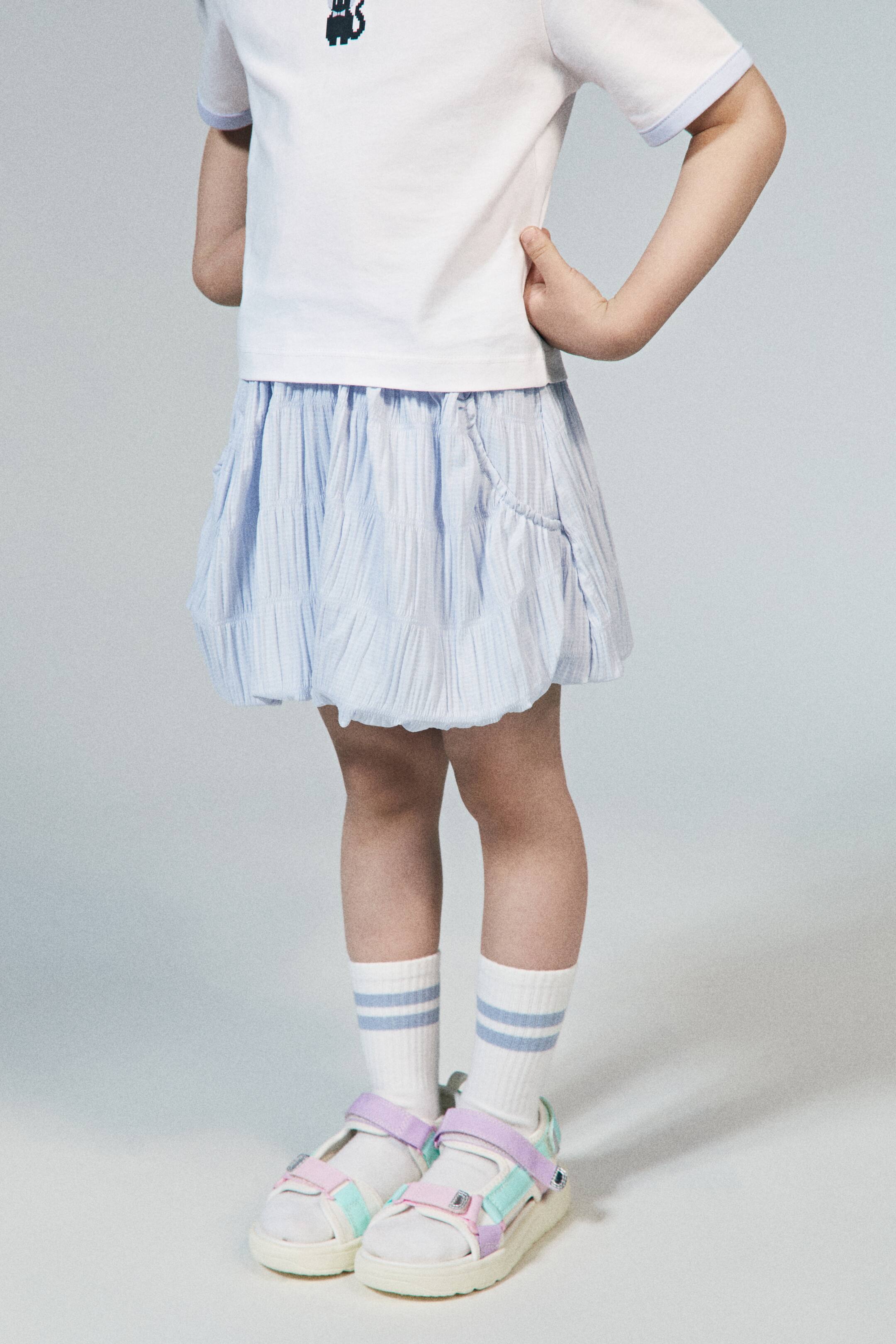 Voluminous skort in seersucker with covered elastication at the waist and decorative side pockets. Cotton lining.