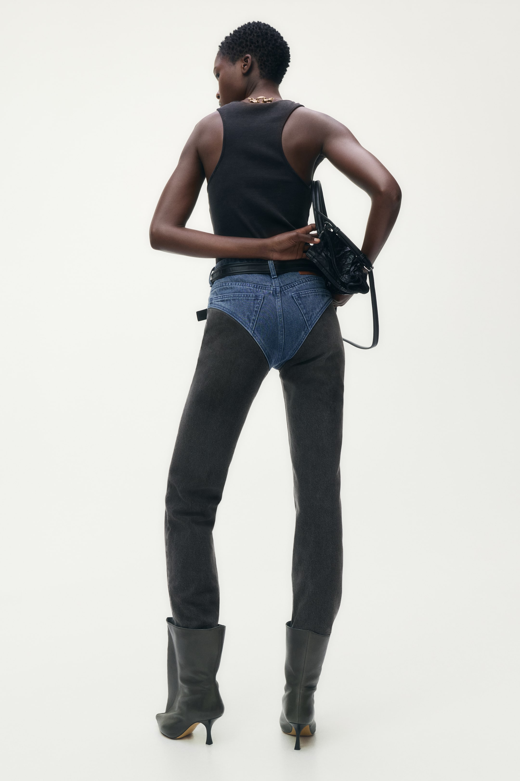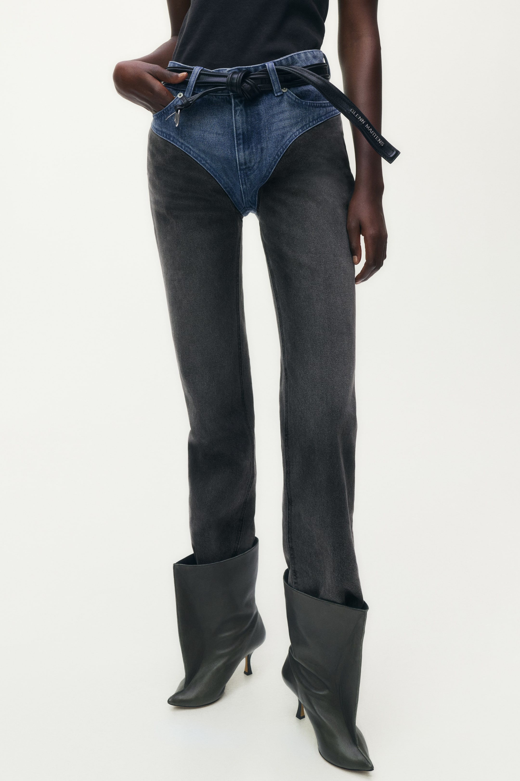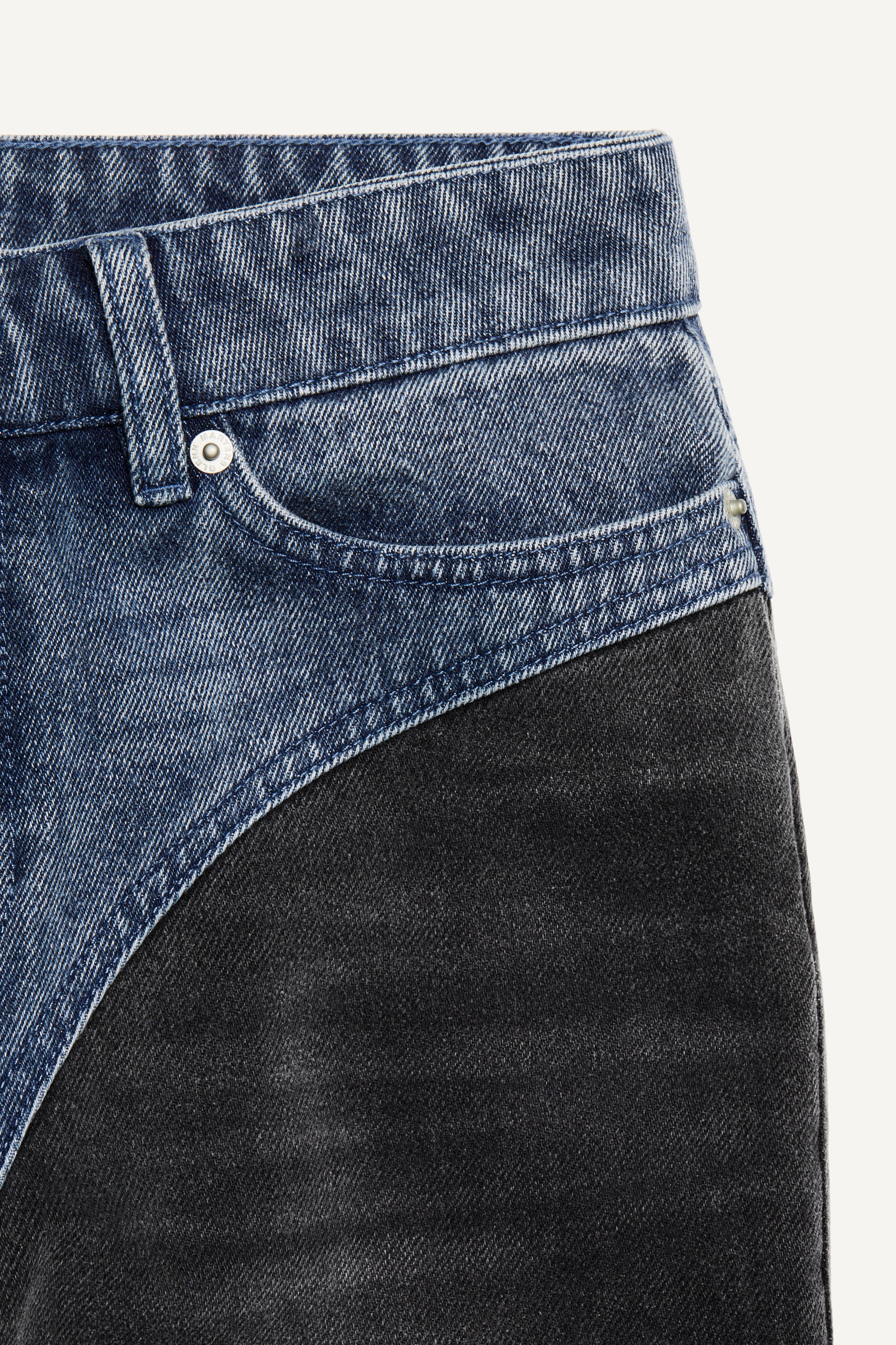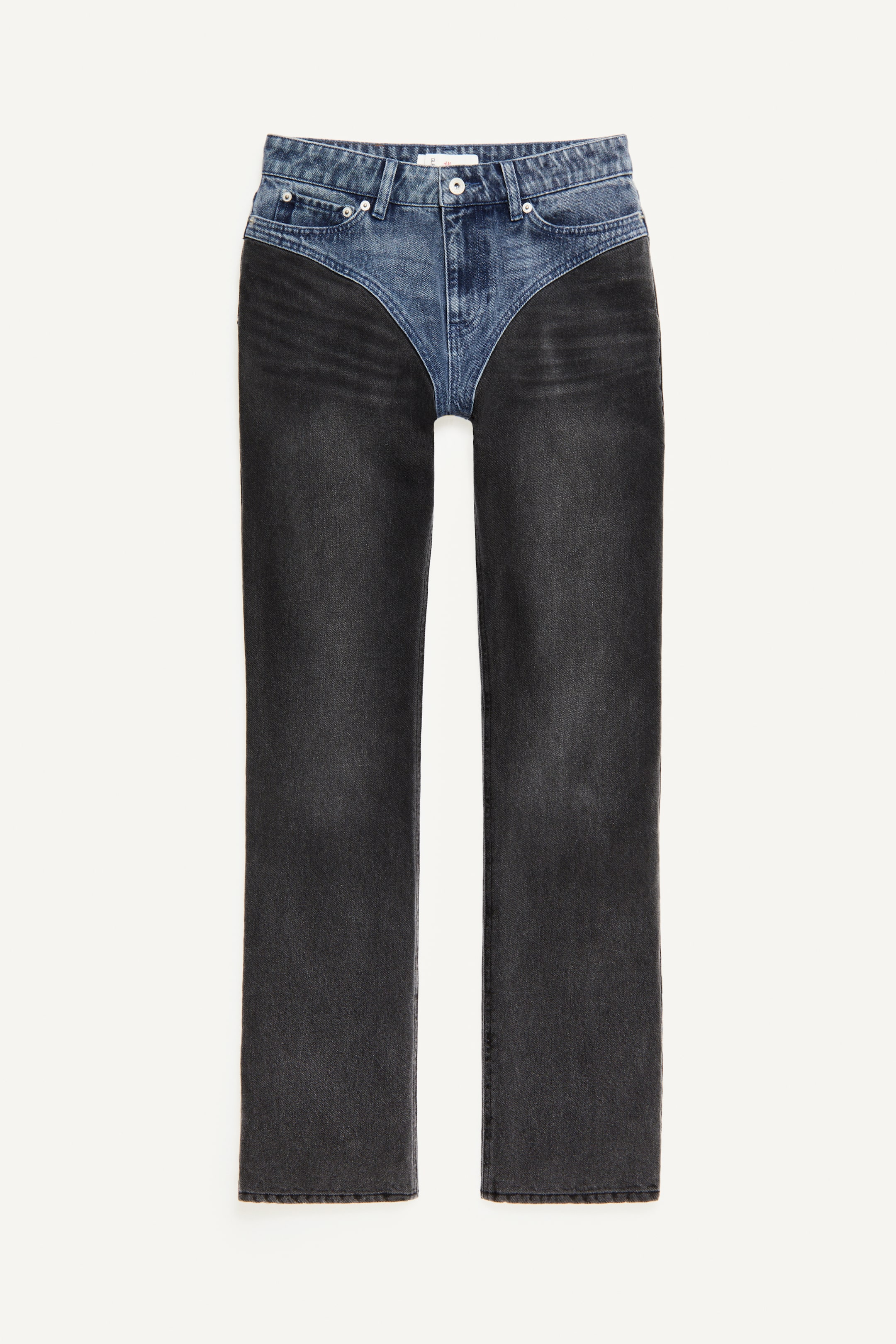 5-pocket jeans in rigid cotton denim featuring a section in a classic blue wash from the waistband to the crotch and straight legs in a washed-out dark grey hue. Regular waist with a zip fly and button. V-shaped yoke at the back and a leather patch embossed with the designer’s logo at the back of the waistband.