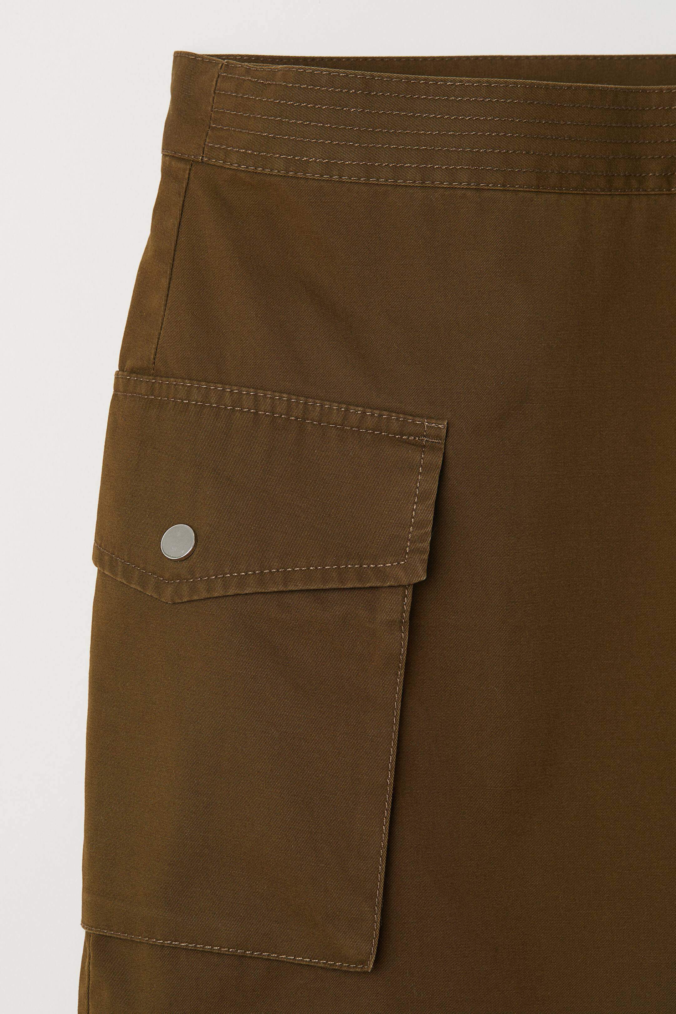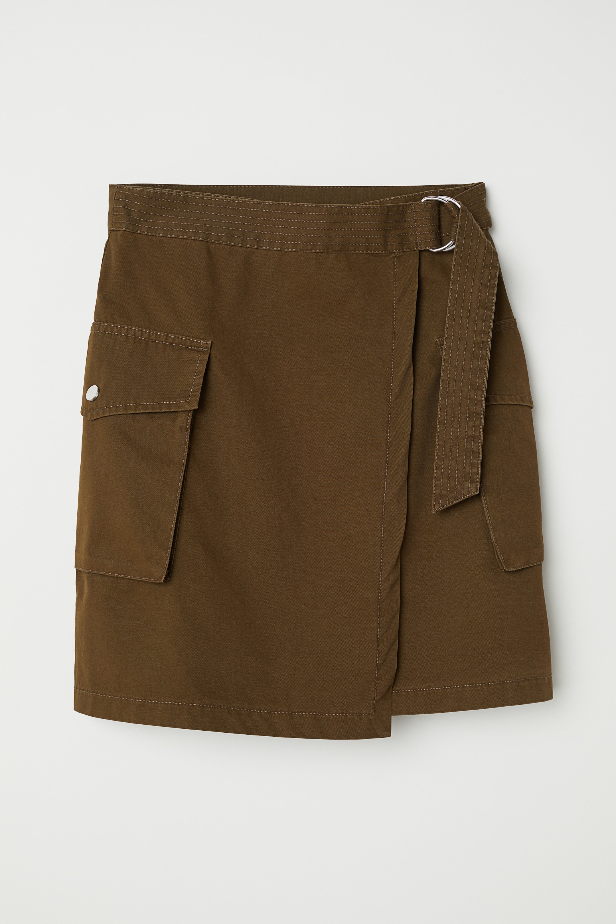 Short wrapover skirt in cotton twill with a concealed button at the waist, sewn-in belt with D-rings and flap side pockets with a press-stud. Unlined.