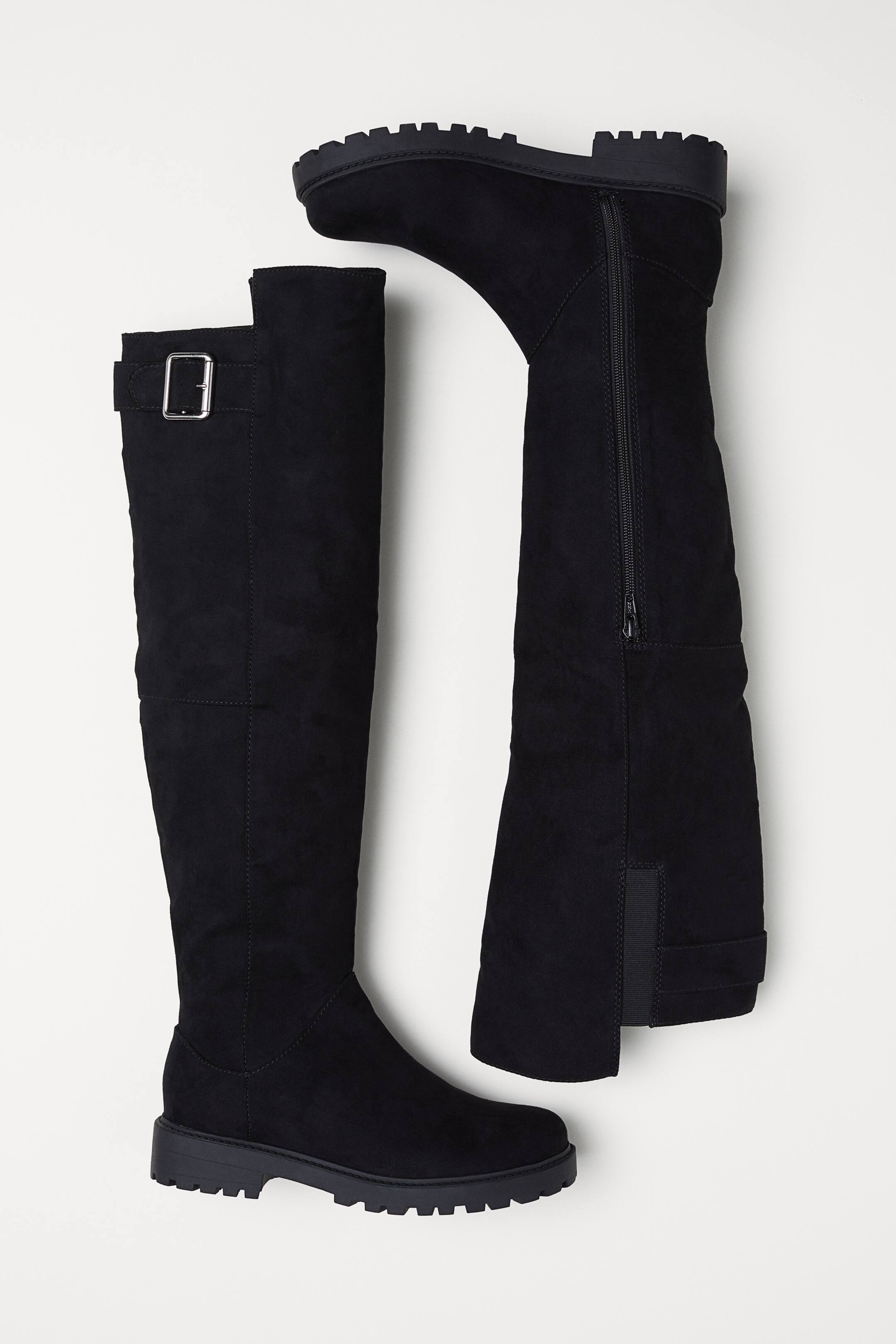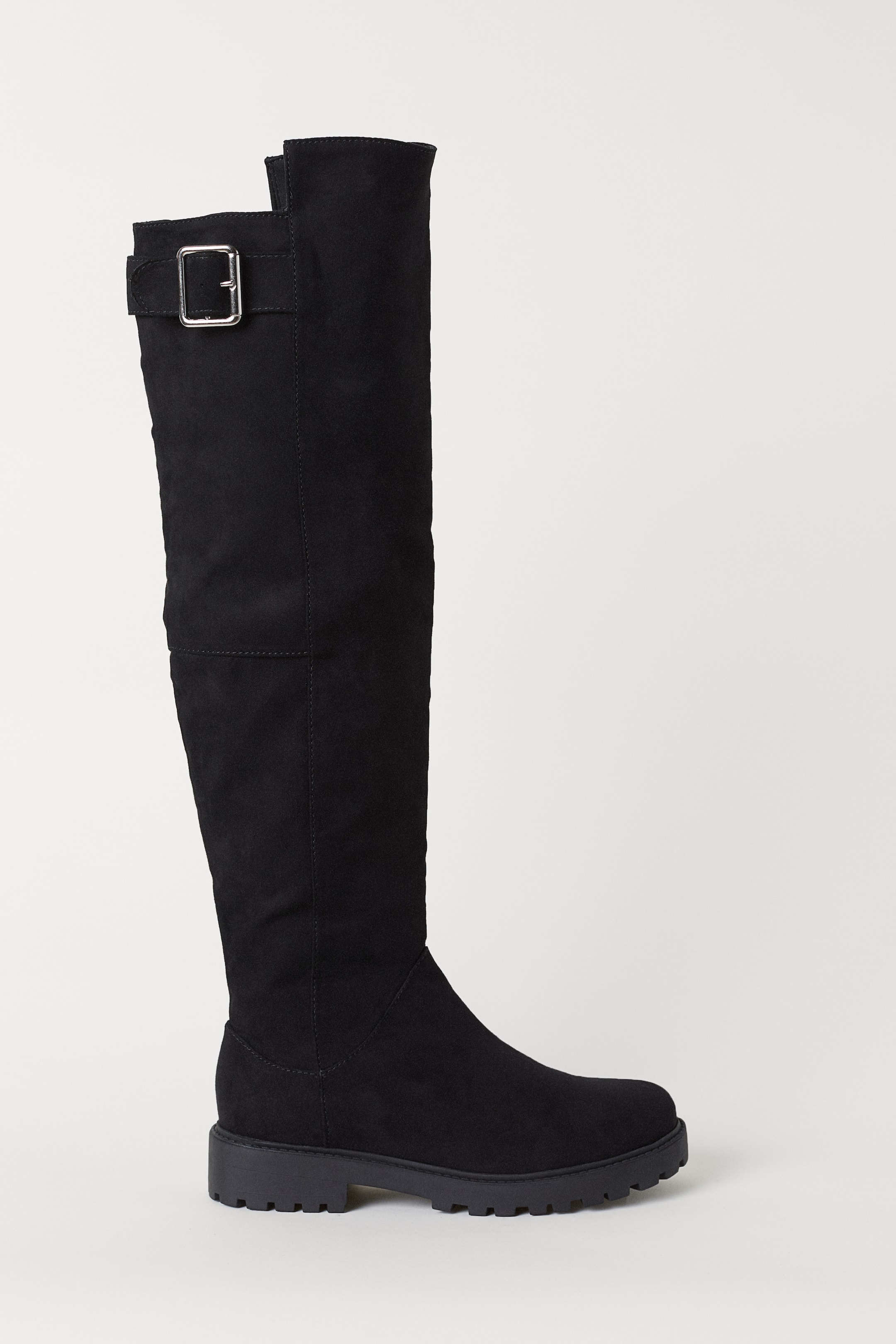 Warm-lined boots in imitation suede with a knee-high shaft, and elastication and a zip in one side. Fabric linings and insoles and chunky rubber soles. Heel 3.5 cm.