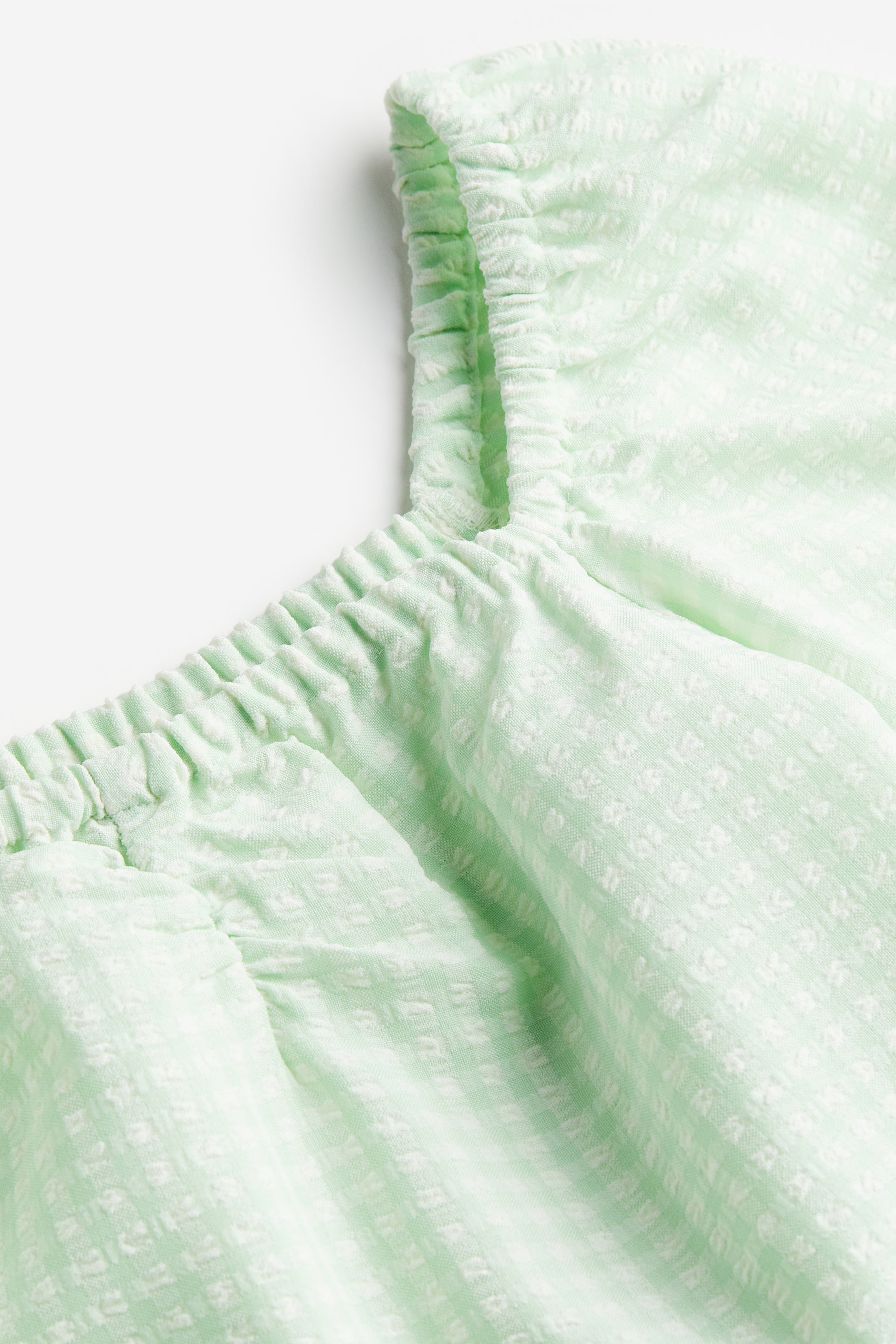 A-line dress in airy seersucker with a square neckline and ruching at the top. Long, balloon sleeves and covered elastication around the neckline and cuffs. Visible seam at the waist and a flared skirt. Unlined.