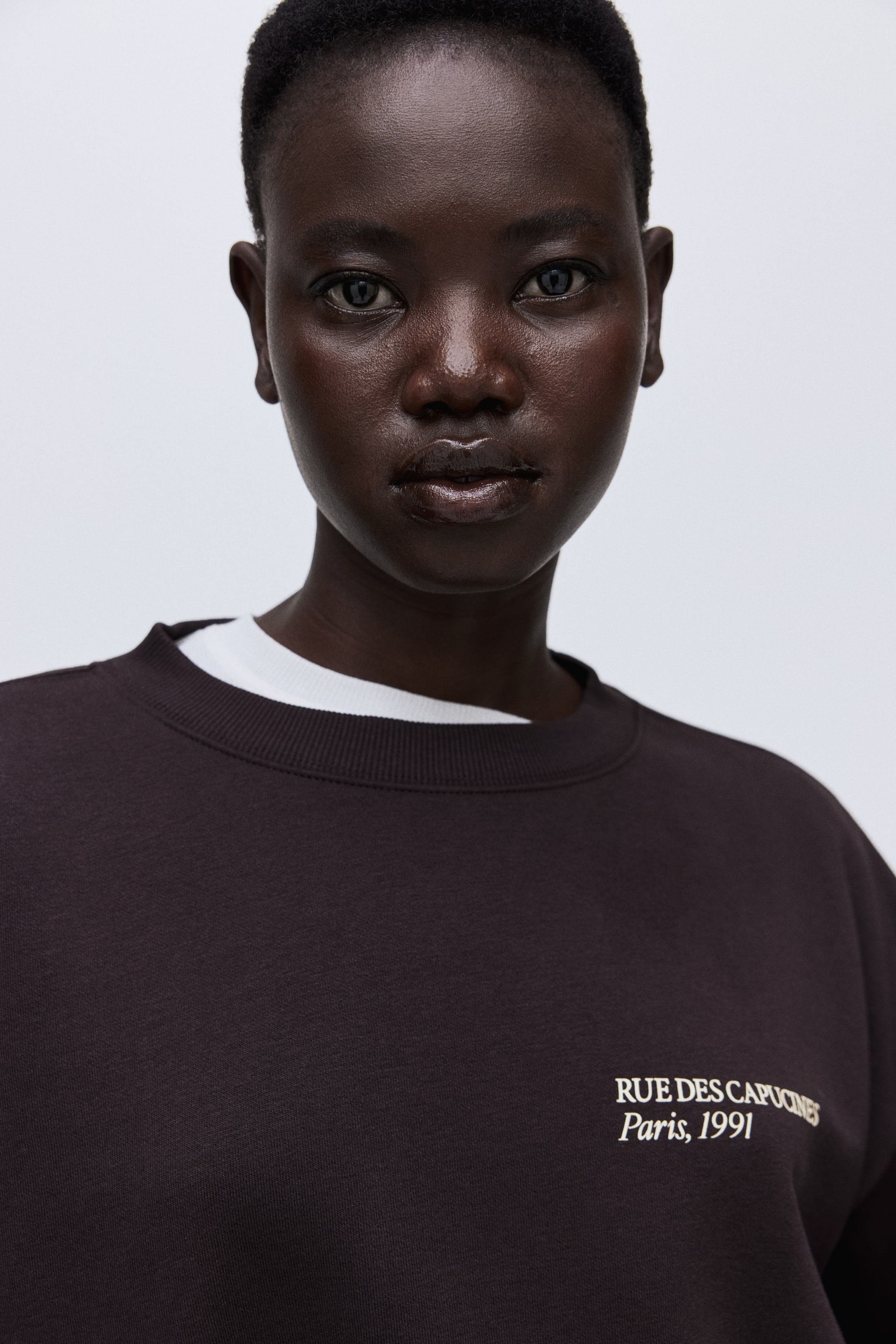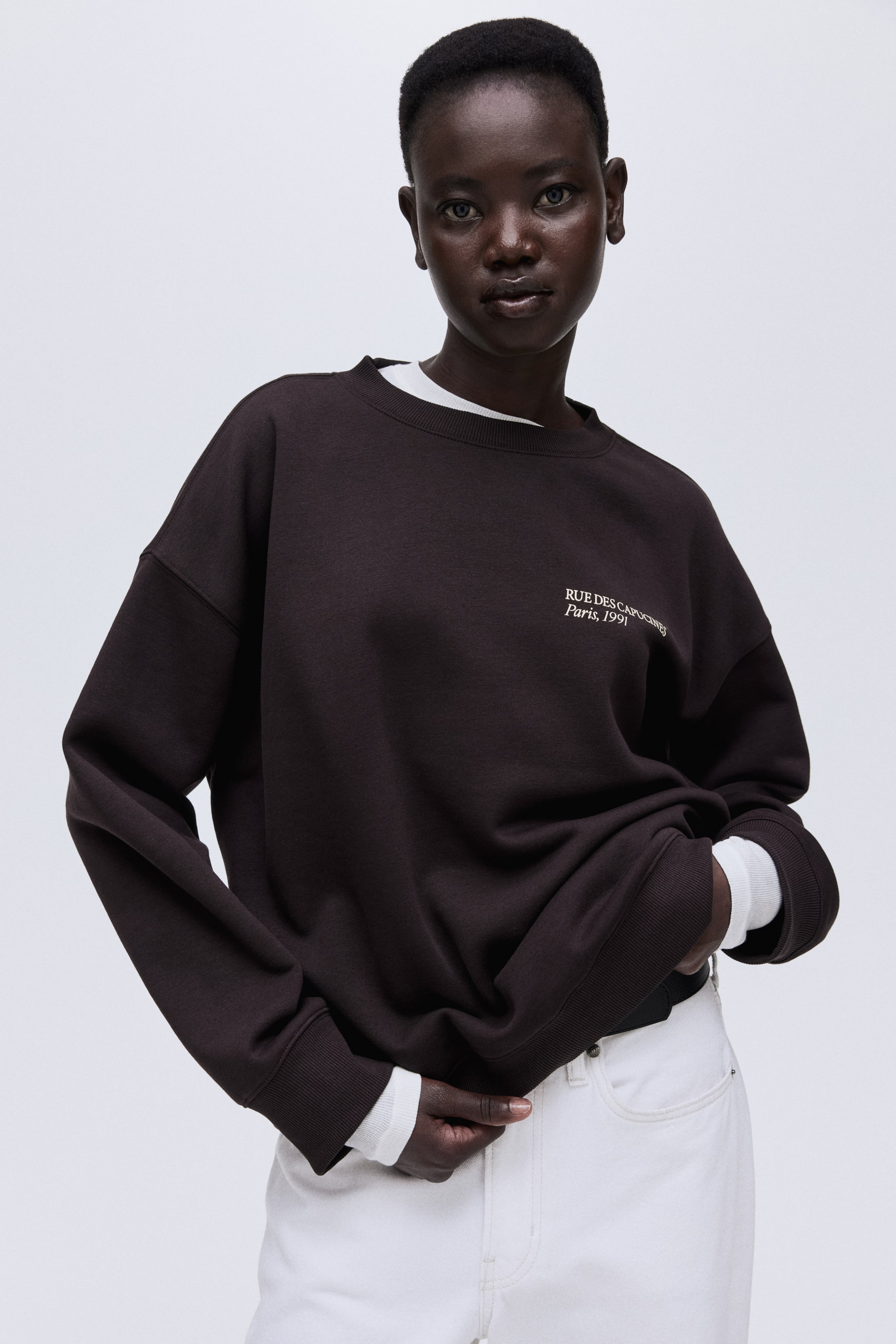 Oversized top in sweatshirt fabric with a soft brushed inside and a text motif on the front. Round, rib-trimmed neckline, dropped shoulders and long sleeves. Ribbing at the cuffs and hem.