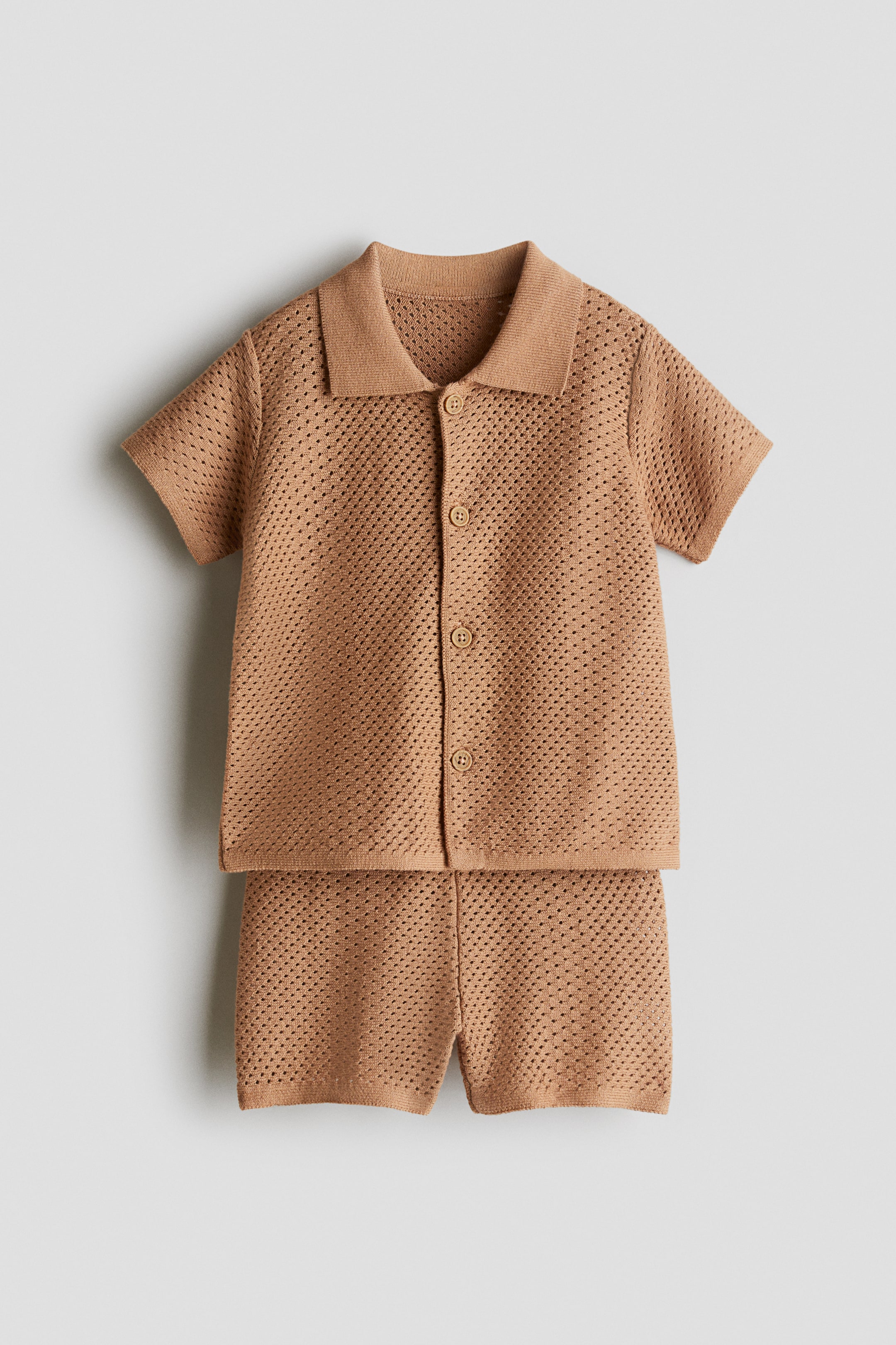 Set with a shirt and pair of shorts in soft, mesh-knit cotton. Short-sleeved shirt with a ribbed collar and buttons down the front. Fine-knit trims at the cuffs and hem. Shorts with an elasticated, drawstring waist and a fine-knit trim at the hems.