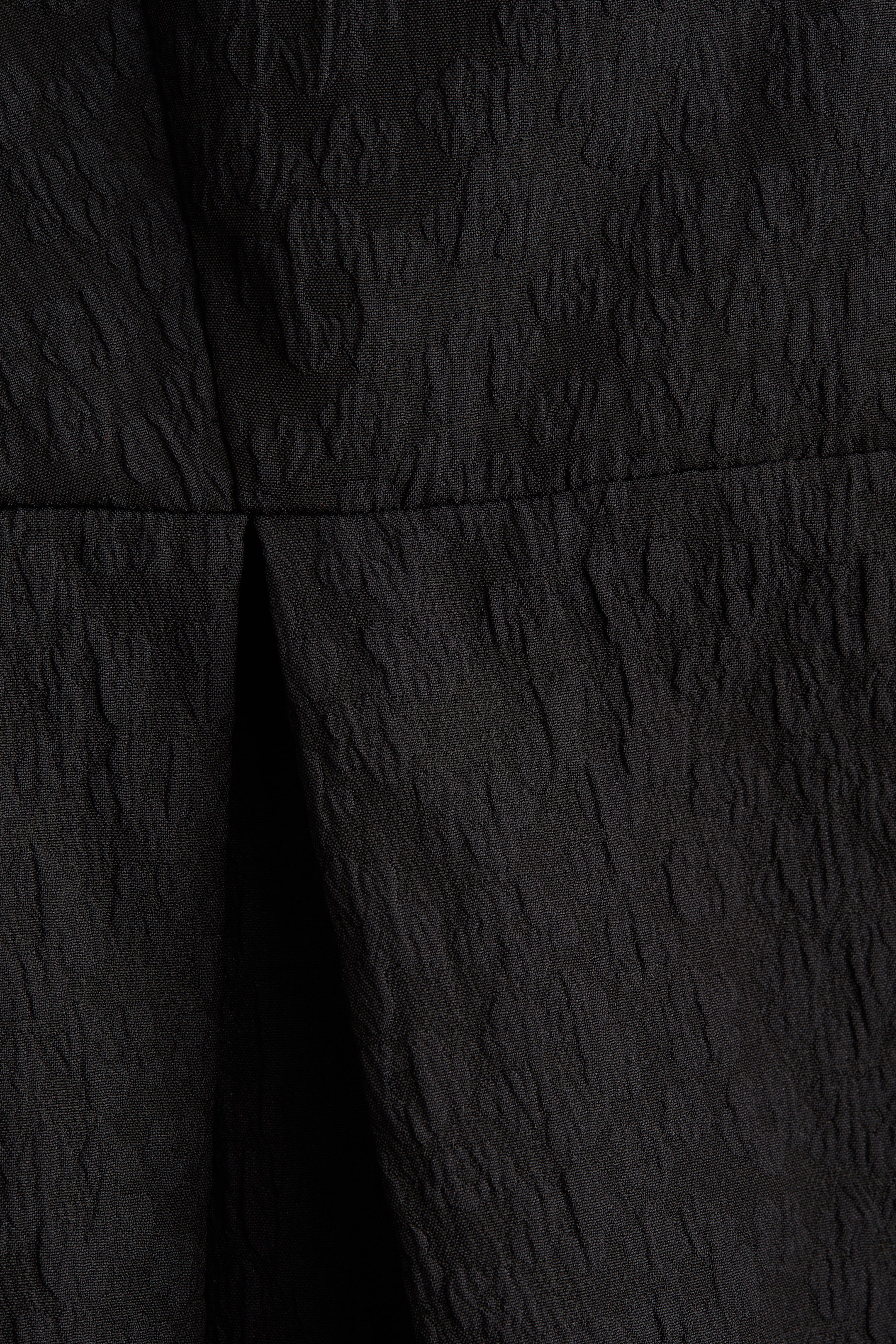 Short, sleeveless dress in a crinkled weave featuring a fitted bodice with a deep V-neckline and a concealed zip and hook-and-eye fastener at the back. Flared skirt with inverted box pleats at the front and back for added volume. Lined bodice.