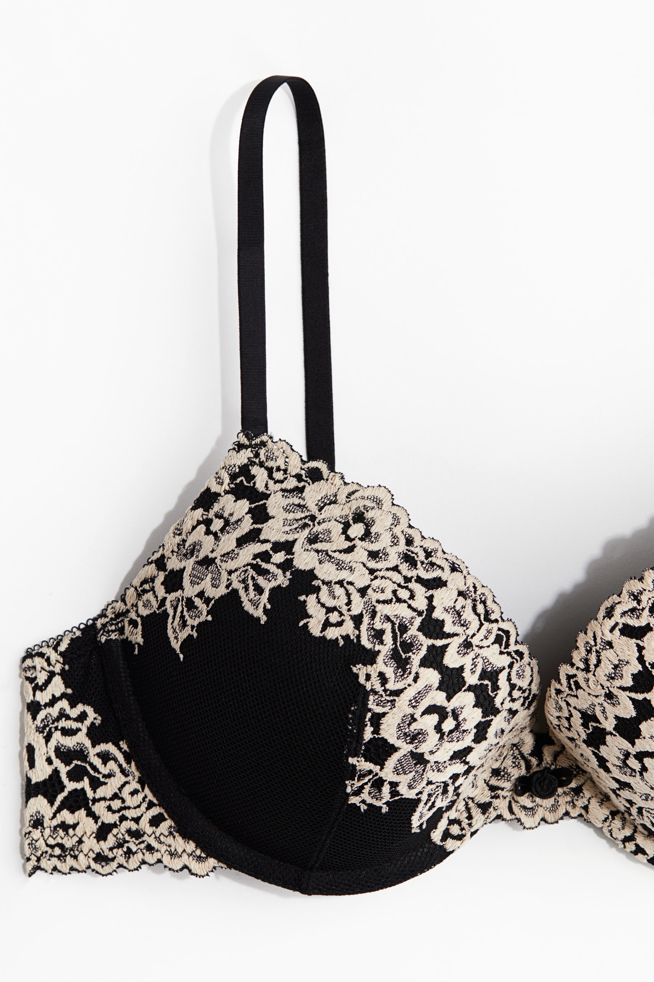 Push-up bra in mesh and lace with adjustable shoulder straps and underwired, padded cups for a larger bust and fuller cleavage. Hook-and-eye fastening at the back.