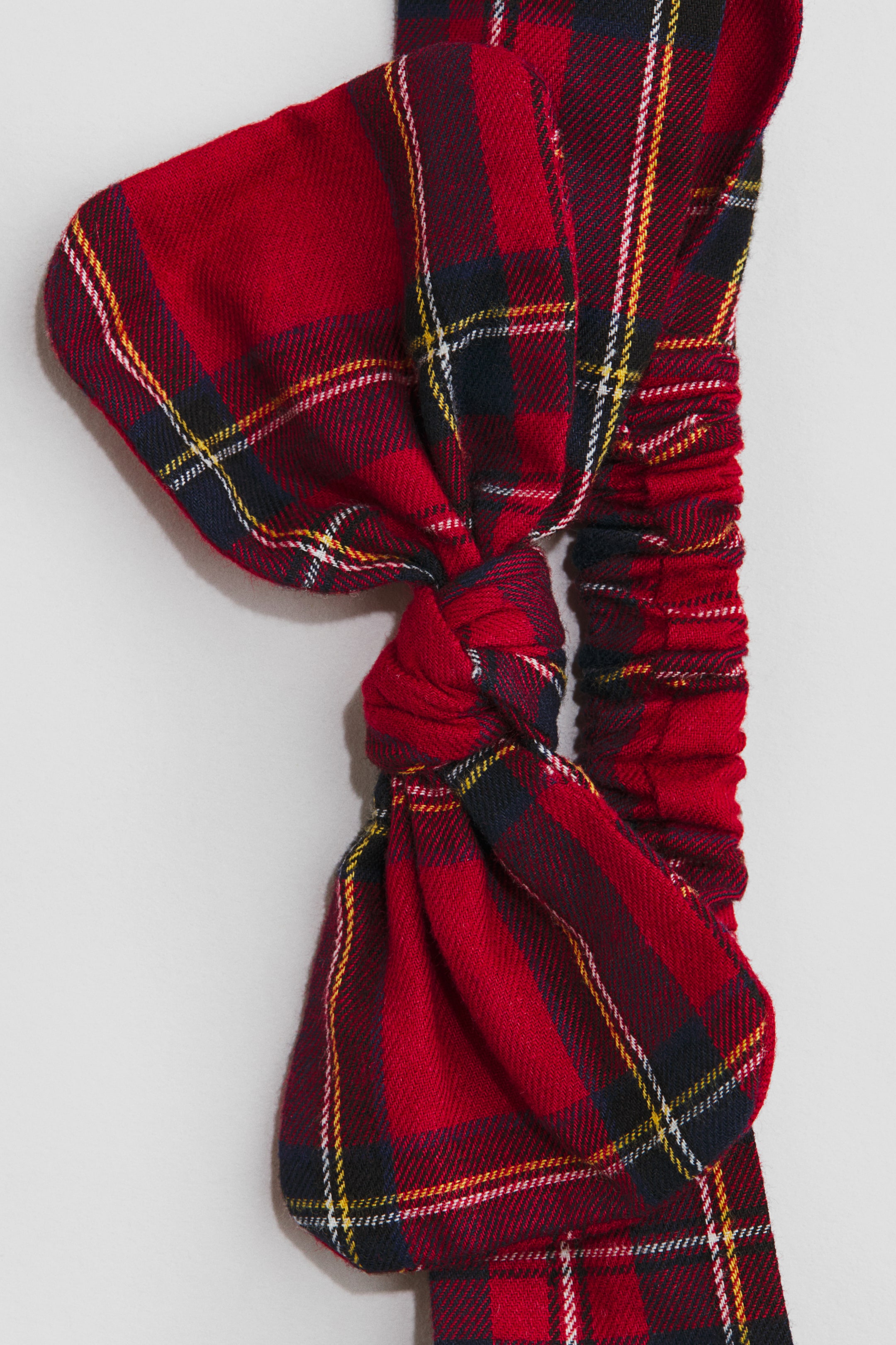 Hairband in soft cotton flannel detailed with a bow. Covered elastication at the back.