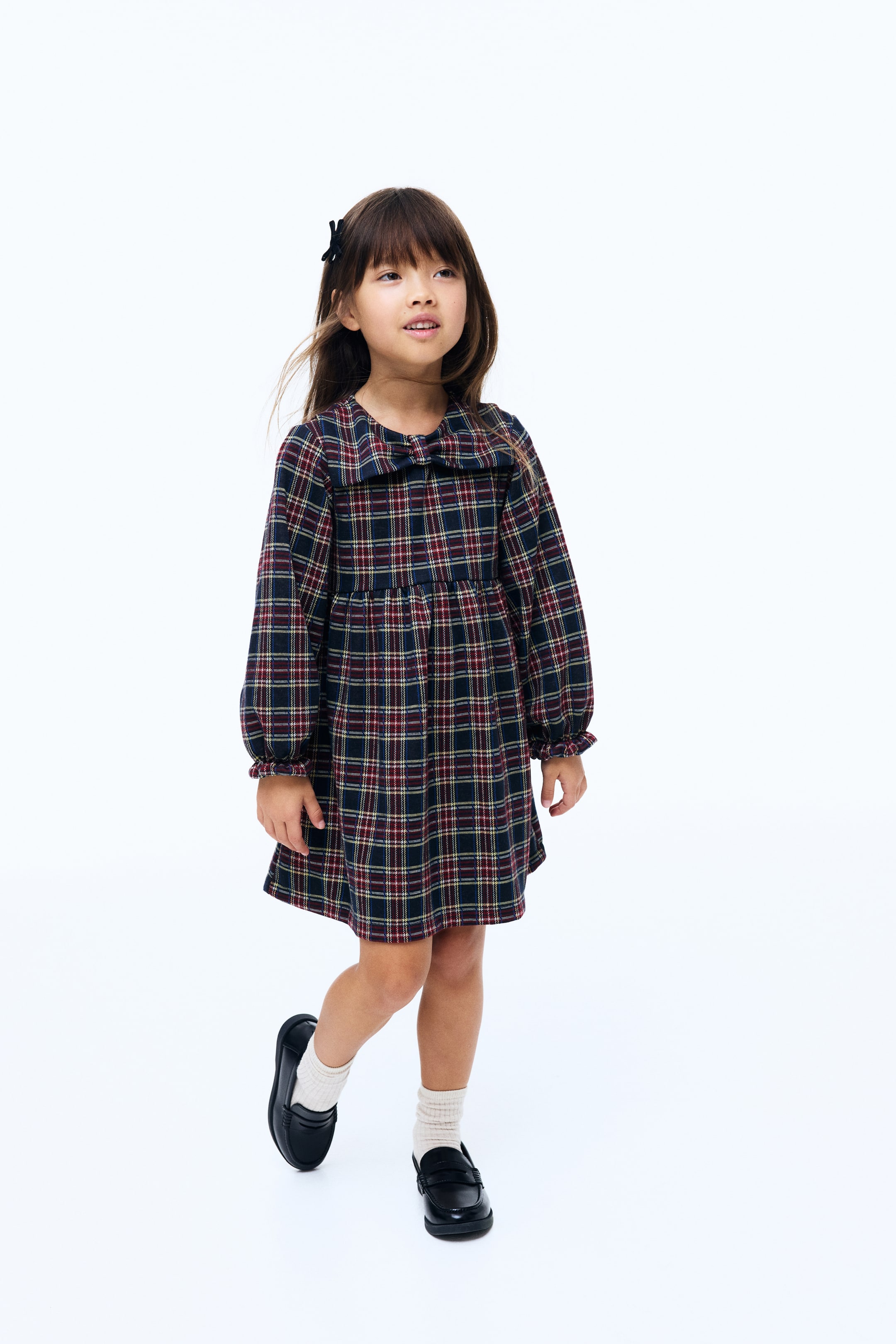 Dress in soft, printed jersey with a bow-shaped collar. Round neckline and an opening with button fastening at the back. Long sleeves with elasticated, frill-trimmed cuffs. Gathers at the waist and a flared skirt.