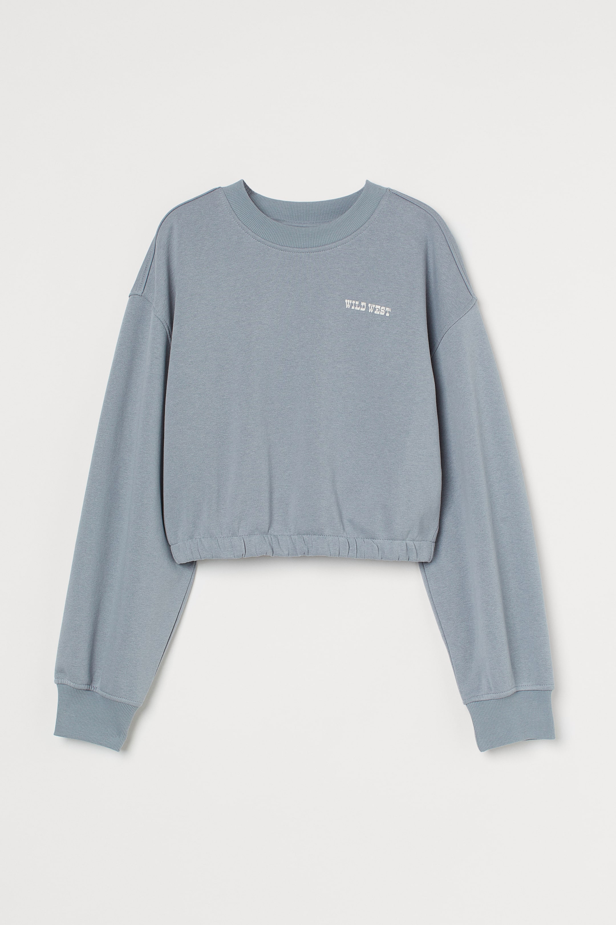 Cropped top in lightweight, printed sweatshirt fabric with a round neckline, dropped shoulders and long, wide sleeves. Ribbing around the neckline and cuffs, and covered elastication at the hem.