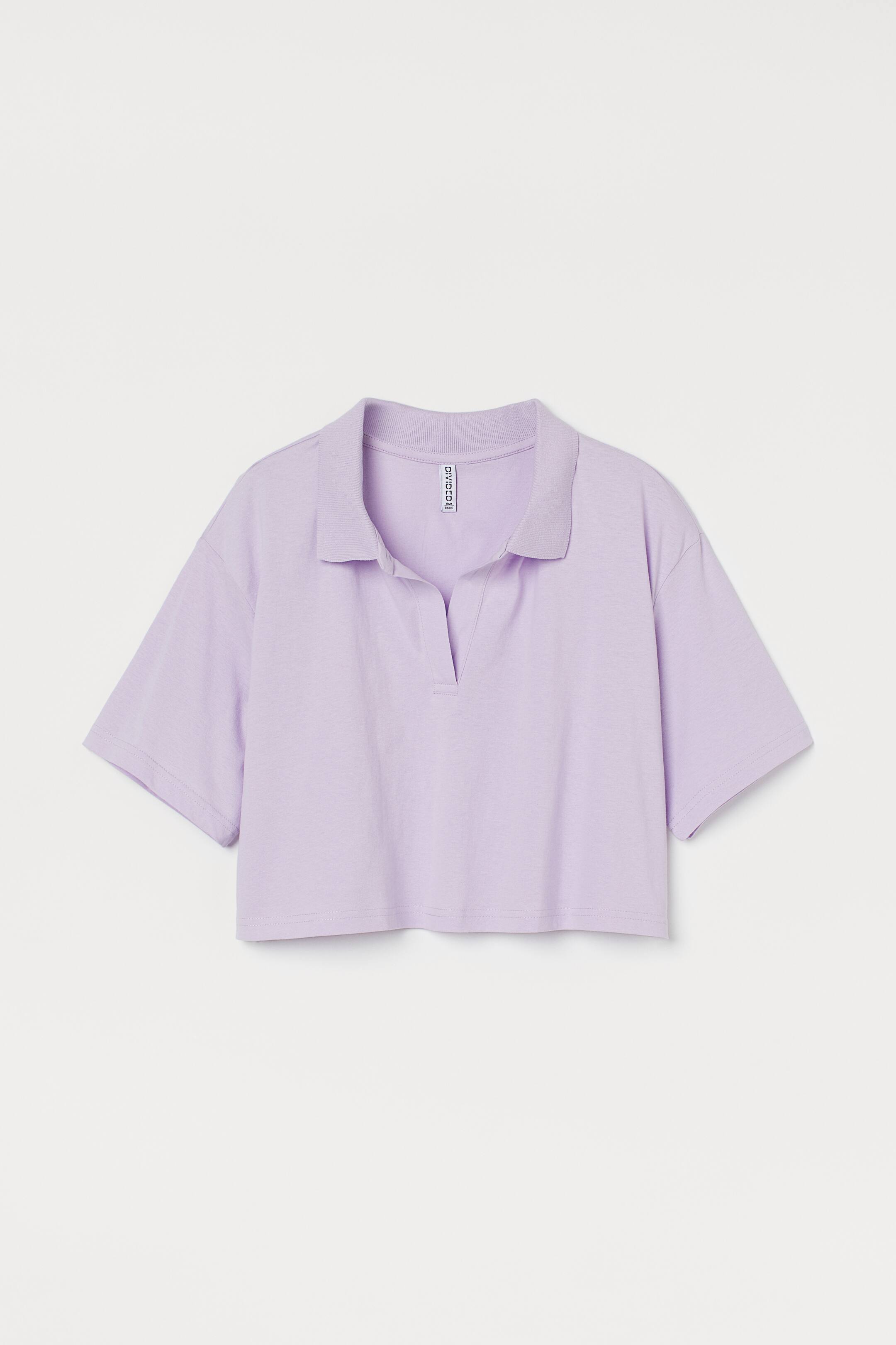 Straight-style, cropped top in soft cotton jersey with a collar and small opening at the top, dropped shoulders and wide sleeves.