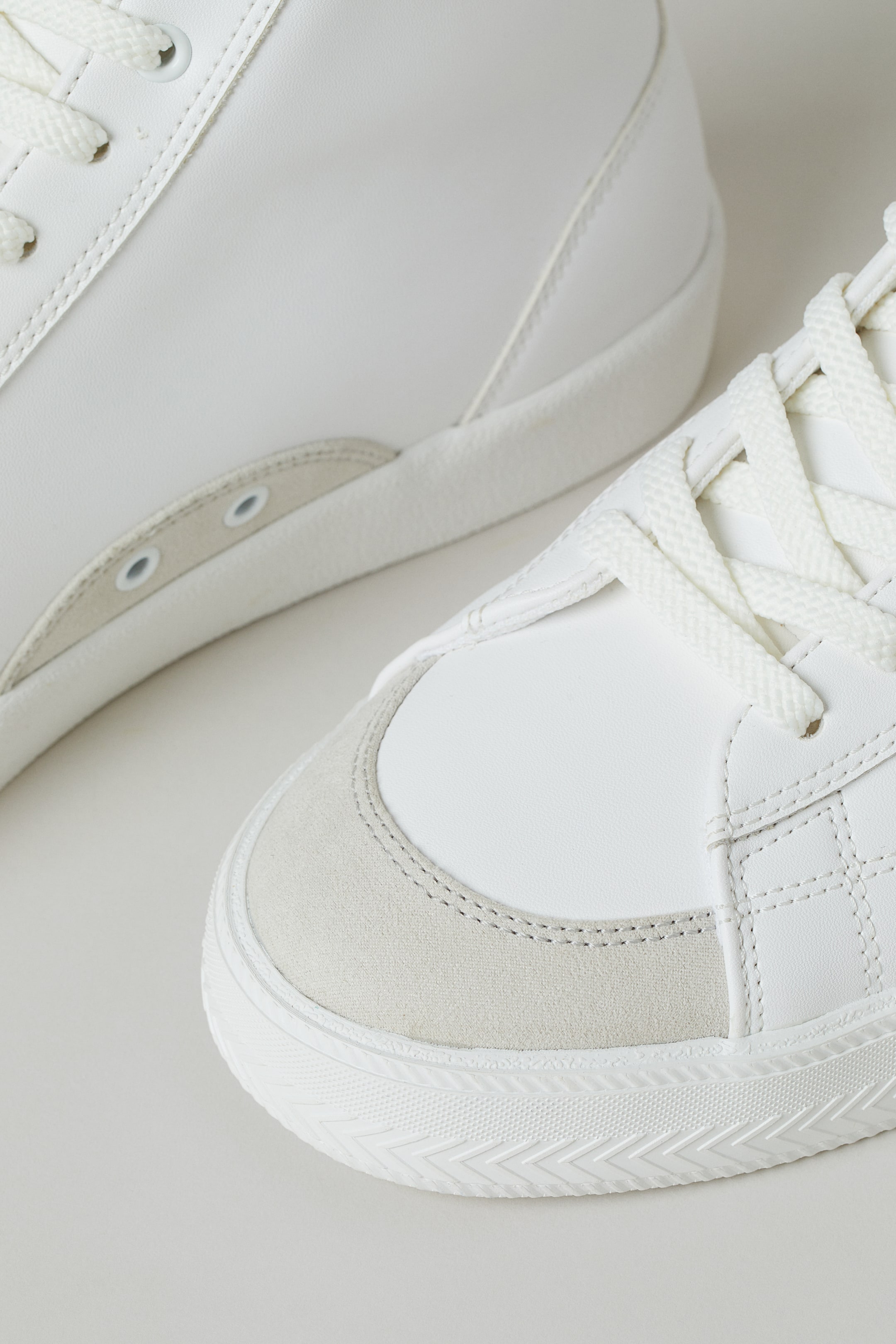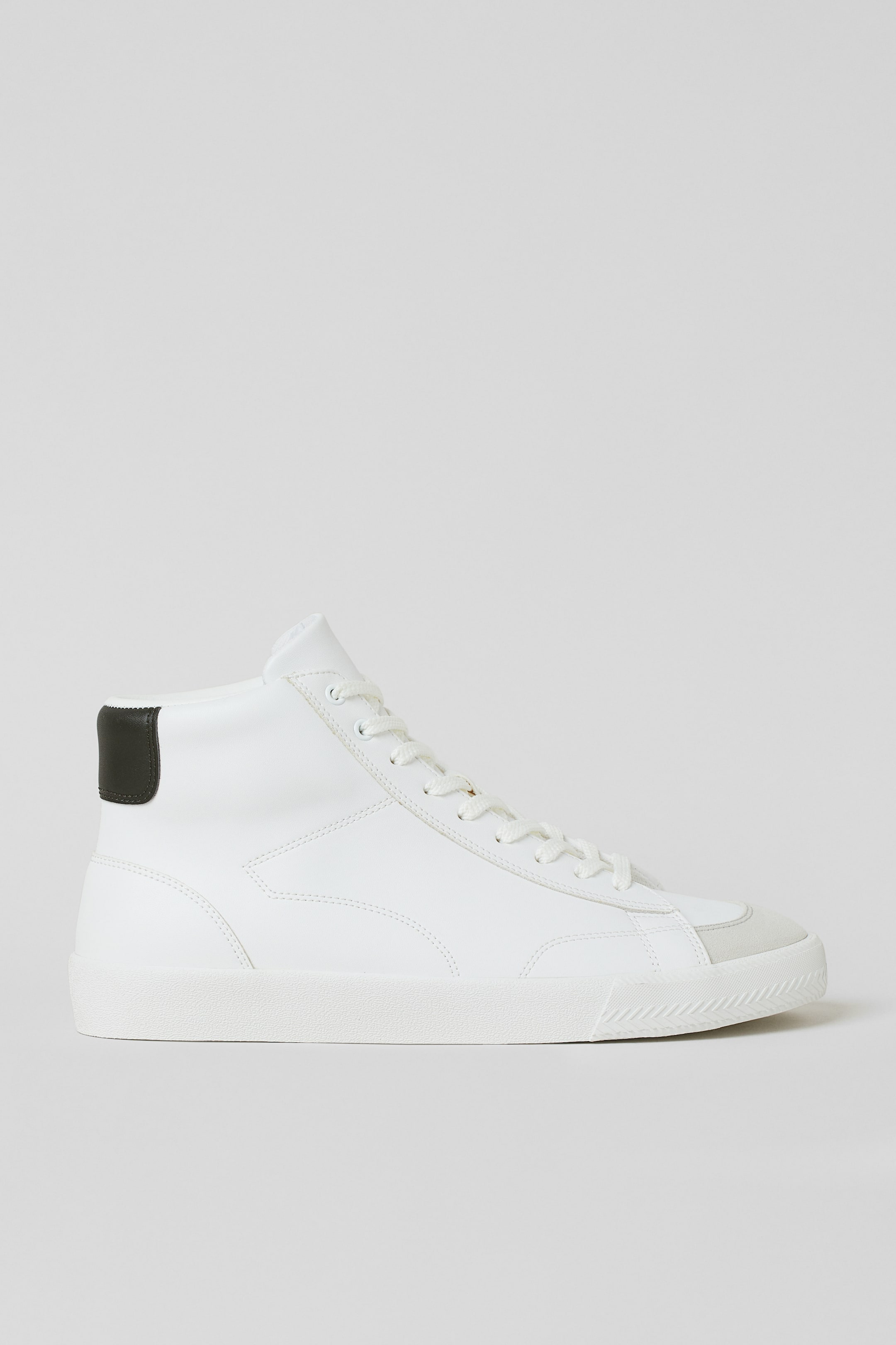Hi-top trainers in imitation leather with imitation suede toe caps. Padded top edge, lacing and a tongue at the front and eyelets in one side. Piqué linings, canvas insoles and patterned rubber soles. Height of soles 3 cm.
