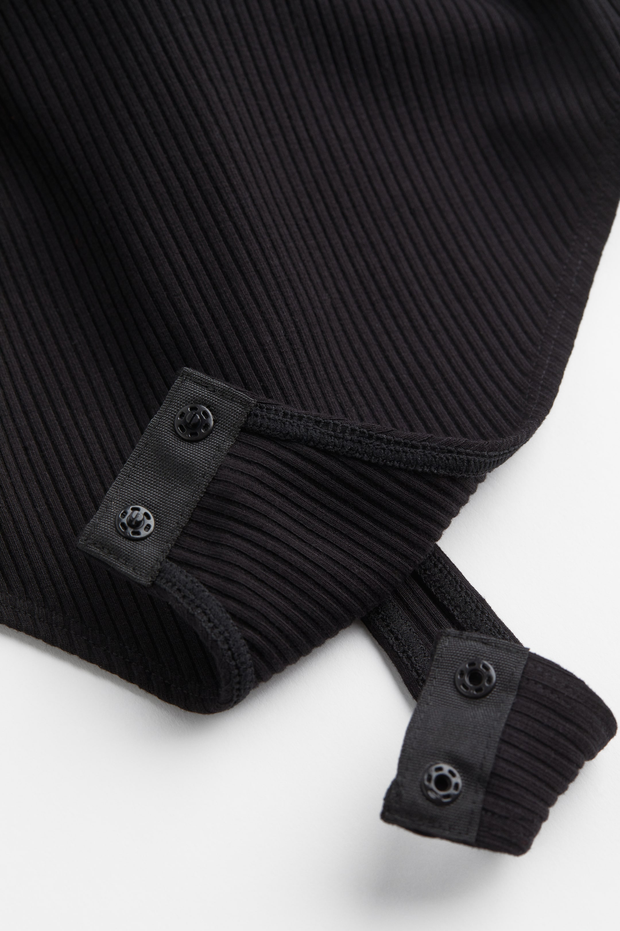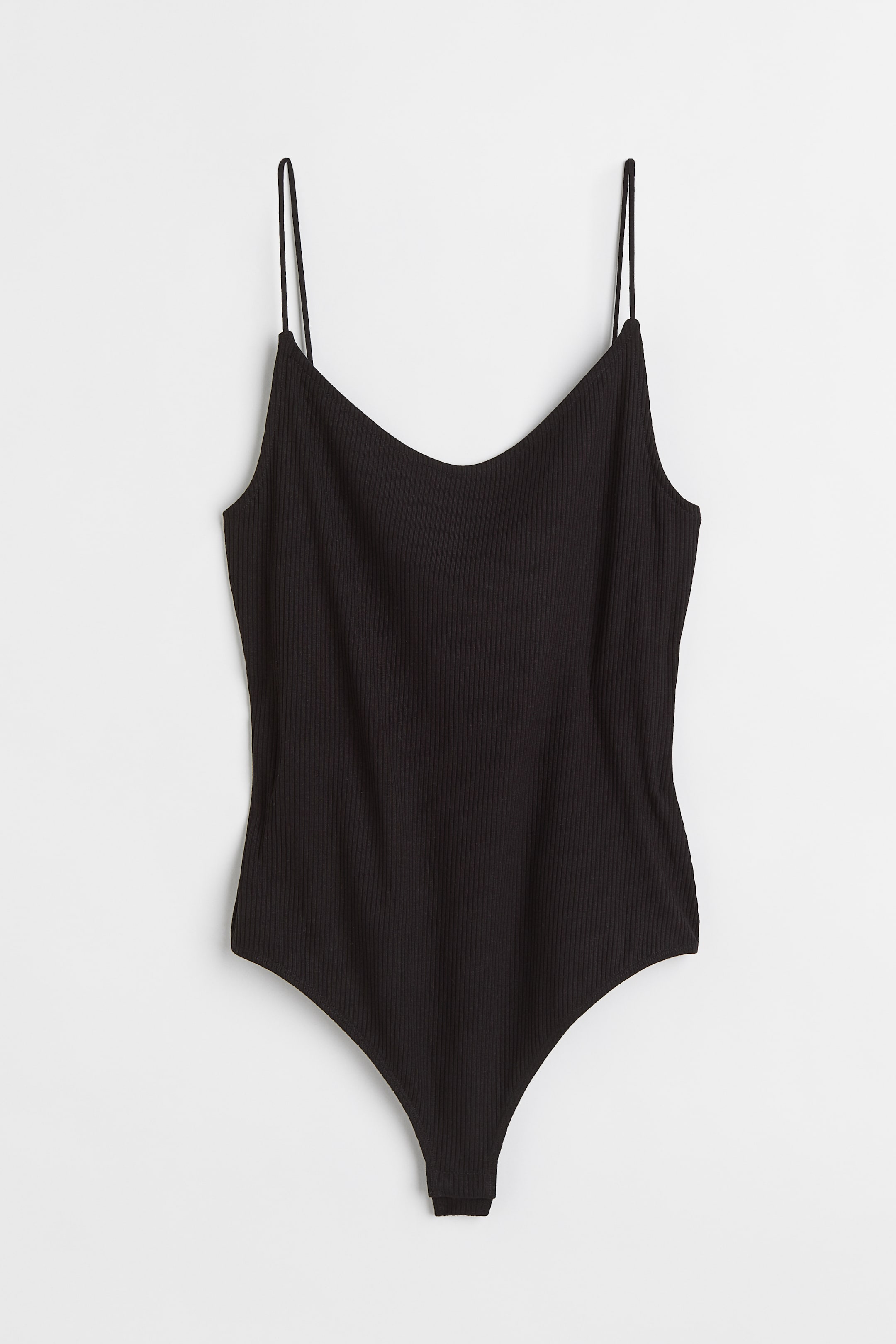 Thong body in ribbed jersey with narrow shoulder straps, a low-cut back, and lined gusset with concealed press-studs.
