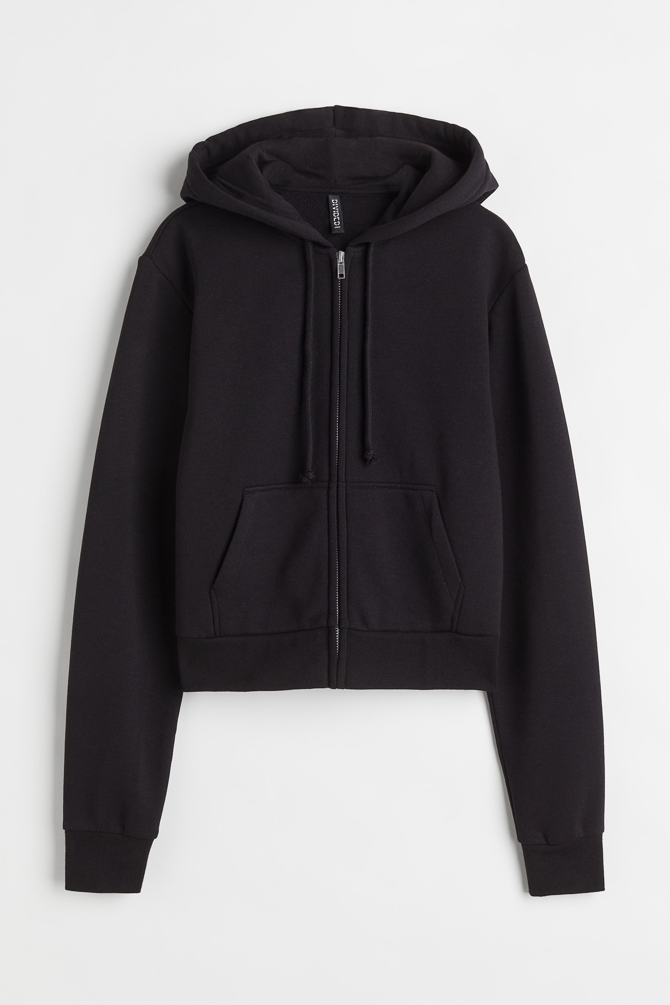 Cropped, fitted zip-through hoodie in sweatshirt fabric made from a cotton blend with a soft brushed inside. Jersey-lined, drawstring hood, a zip down the front, front pockets, long sleeves and ribbing at the cuffs and hem.