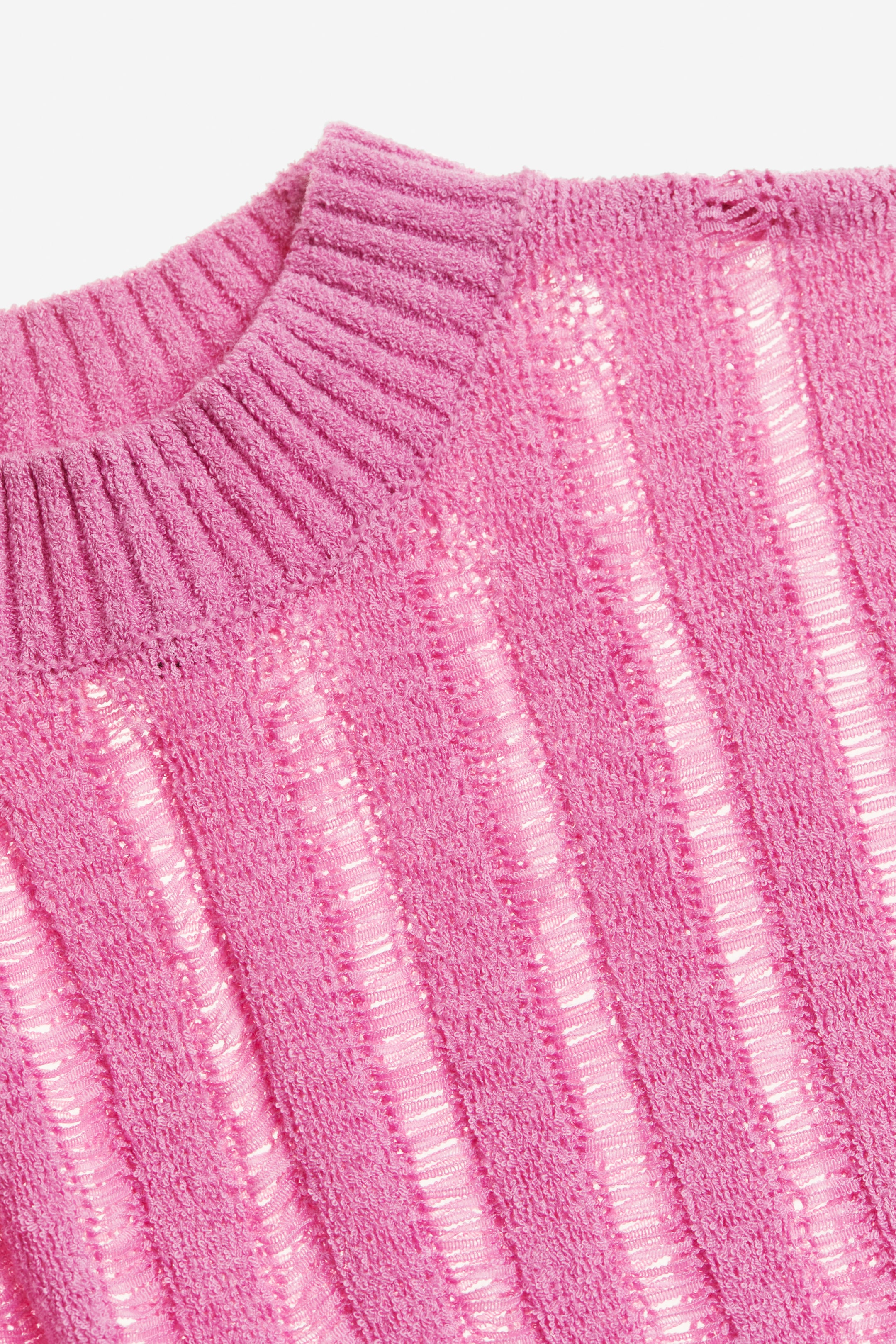 Top in a soft knit with a ladder-stitch look. Ribbed, stand-up collar, short sleeves and a straight hem. Ribbing at the cuffs and hem.