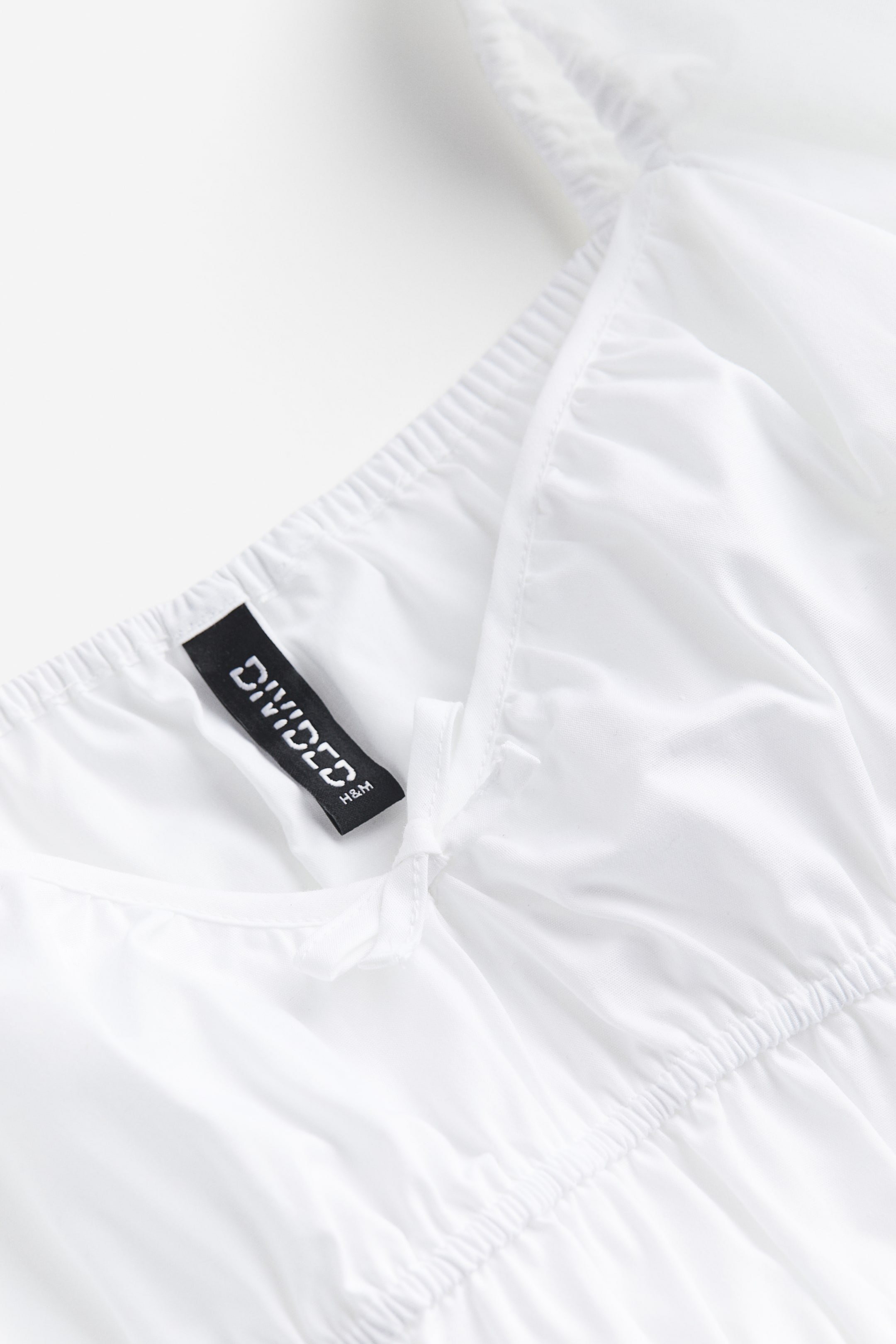 Short blouse in an airy cotton weave with a V-shaped neckline, small, decorative bow at the front and short sleeves. Narrow elastication over the shoulders, at the cuffs, top of the back, below the bust and above the hem to create a gently ruched effect.