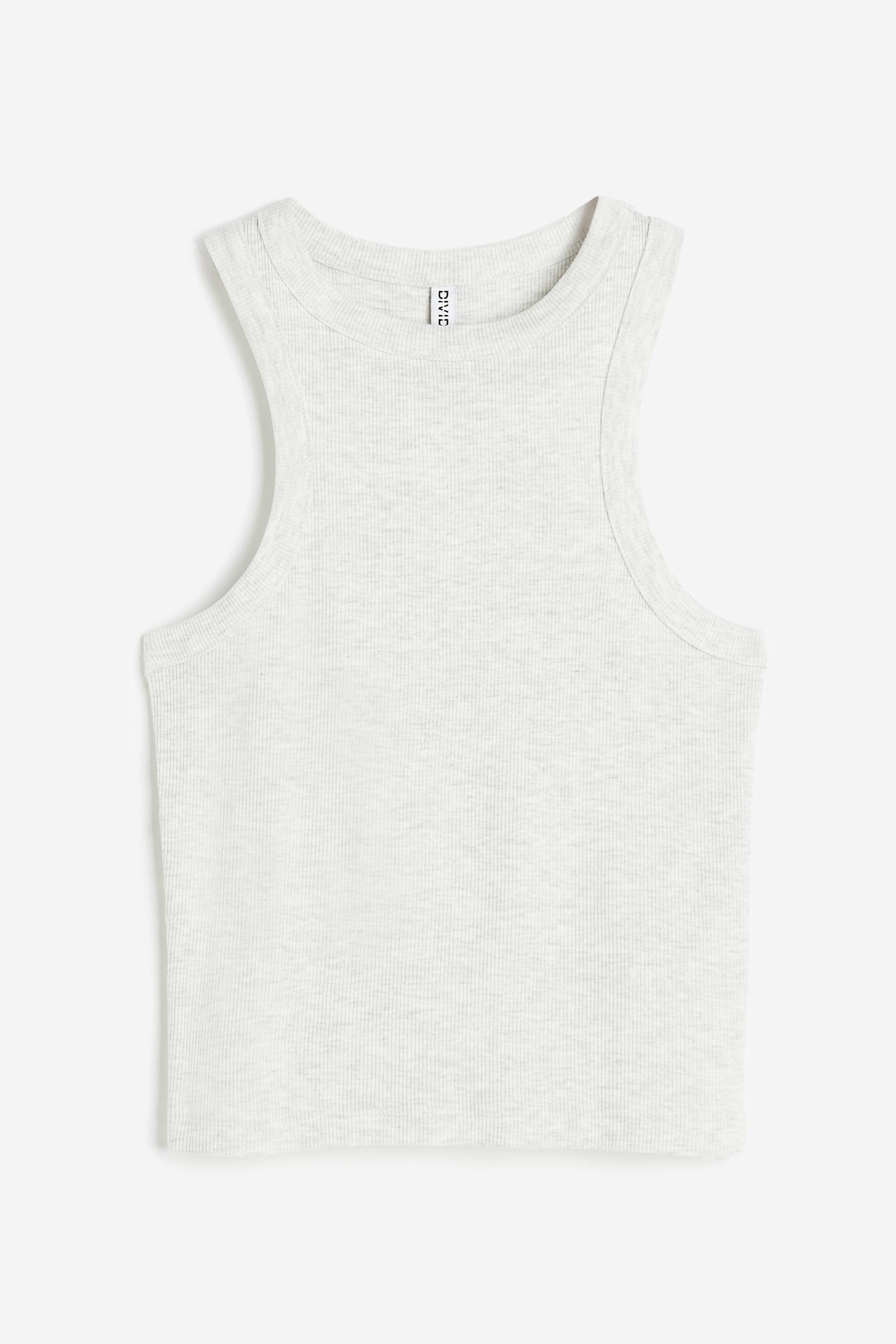 Fitted vest top in ribbed cotton jersey with a narrow trim around the neckline and armholes. Narrow cut at the top and a racer back.