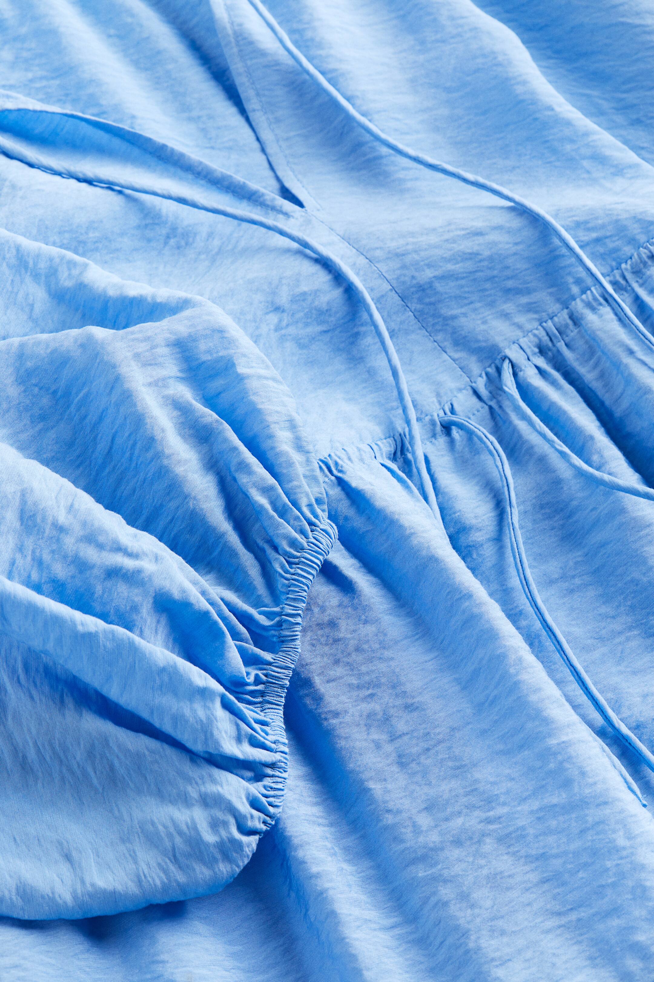 Short, loose-fit dress in woven fabric featuring a deep V-neckline with spaghetti ties at the front. Raglan balloon sleeves with elasticated cuffs and covered elastication with a spaghetti drawstring at the waist. Gently flared skirt with a gathered seam at the hip. Unlined.