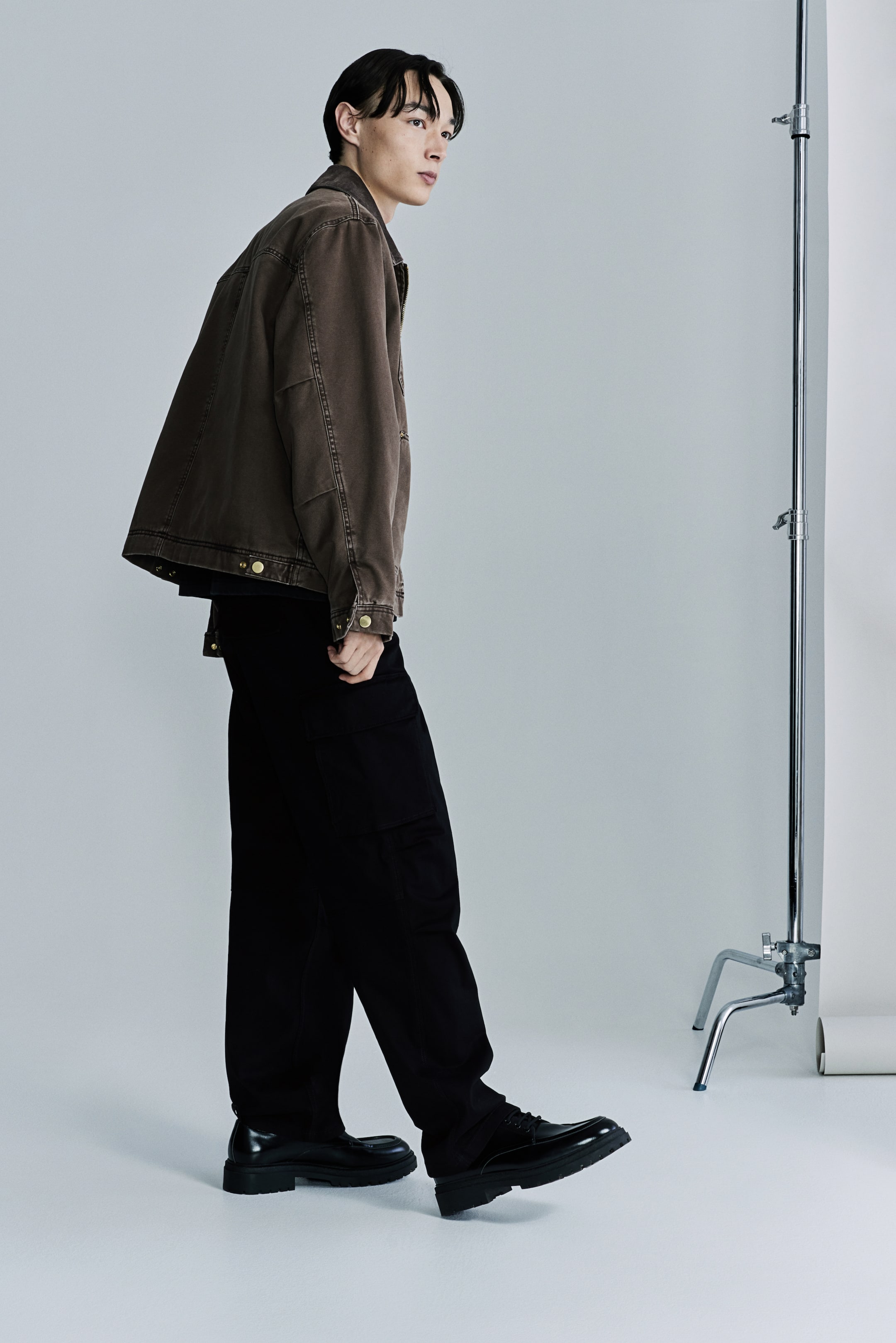 Cargo trousers in sturdy cotton twill with a zip fly and button. Diagonal side pockets, flap back pockets and bellows leg pockets with a flap and concealed press-studs. Pleats at the knees for added width. Relaxed fit for a casual but not oversized silhouette.
