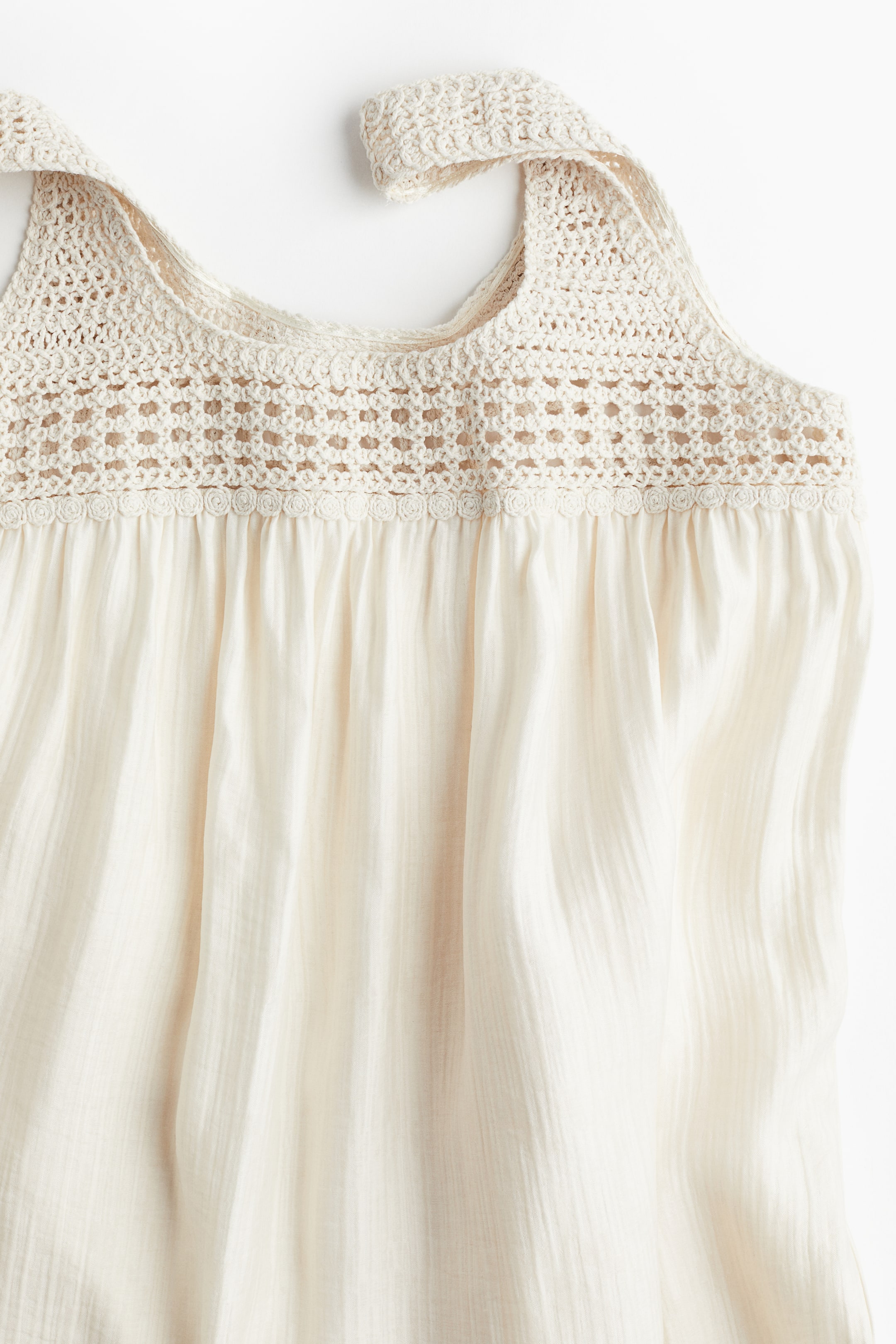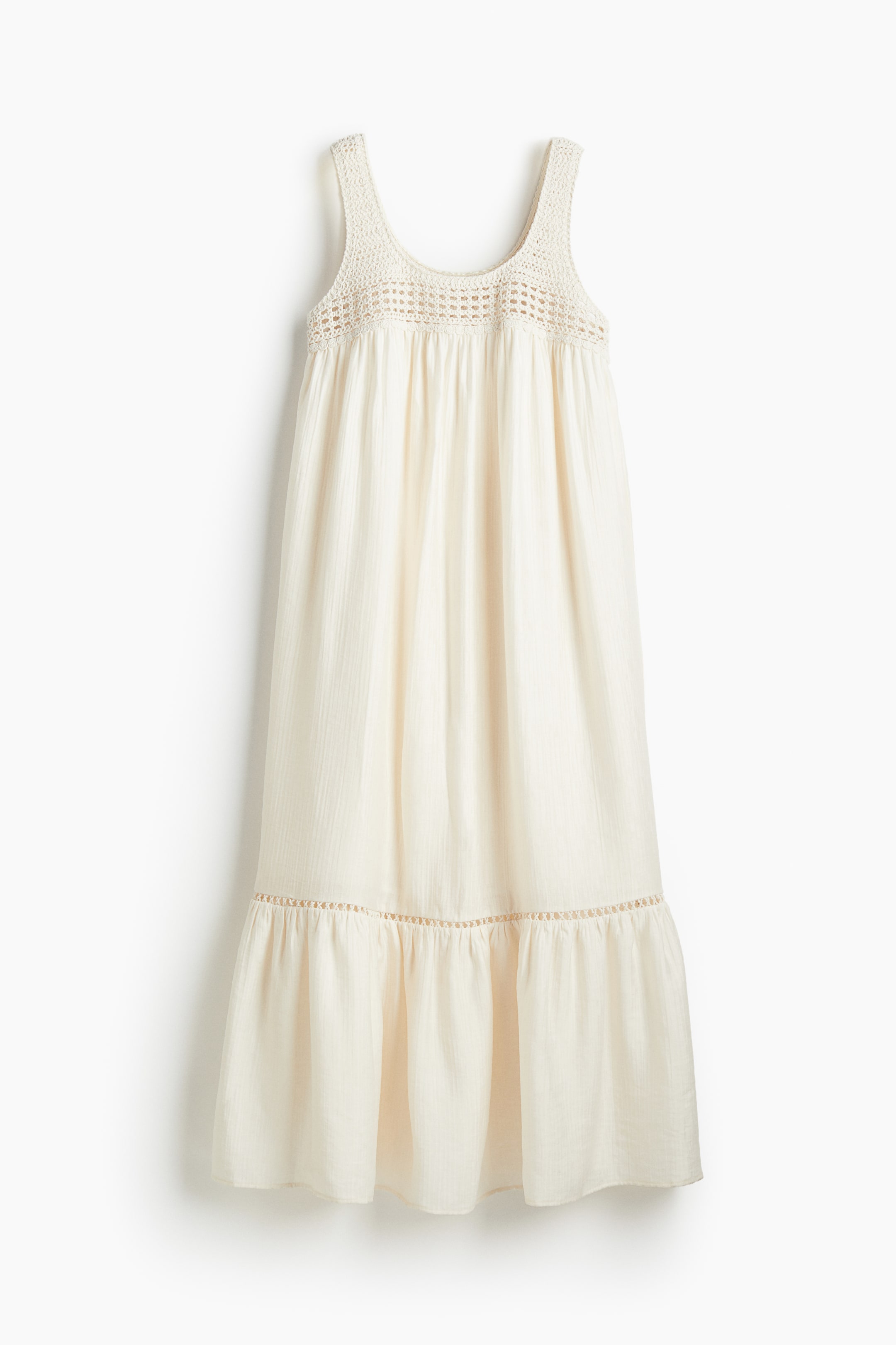 Maxi dress in a crêpe weave with wide shoulder straps and yoke in a crochet-look knit. Loose fit with a gathered seam at the top and hem for added width. Partly lined.