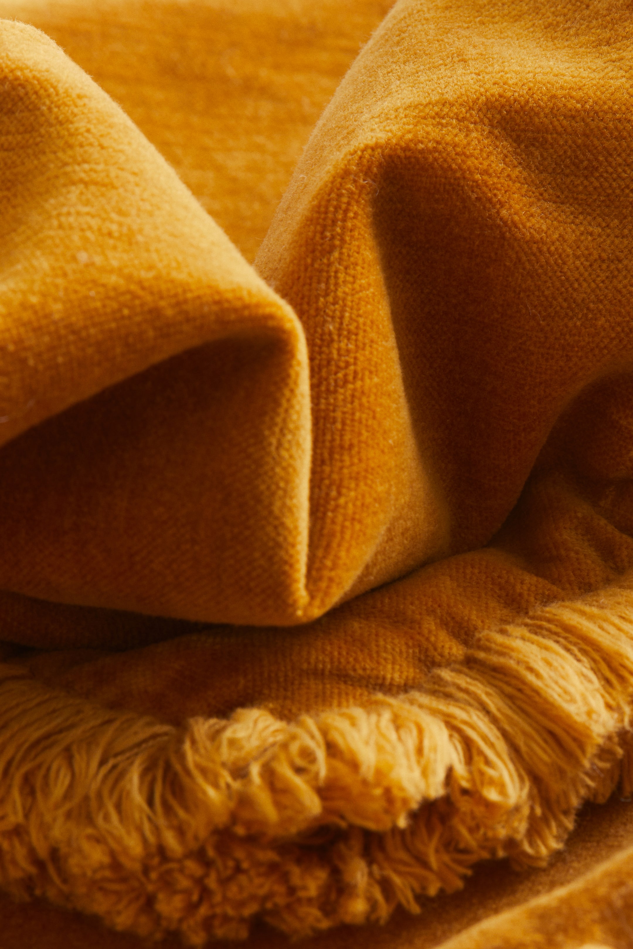 Cushion cover in velvet with fringes along all four sides and a concealed zip on the back.