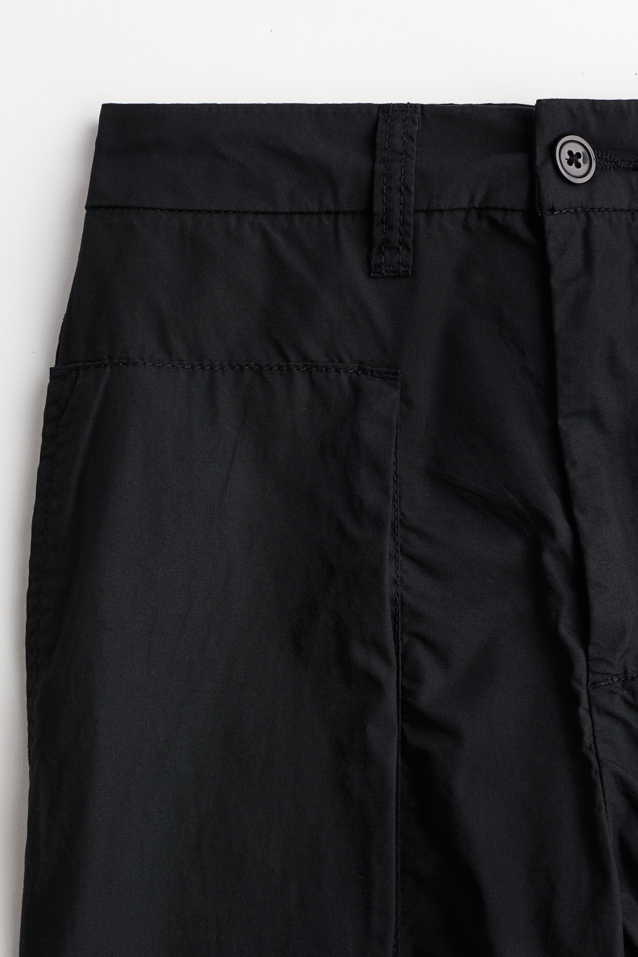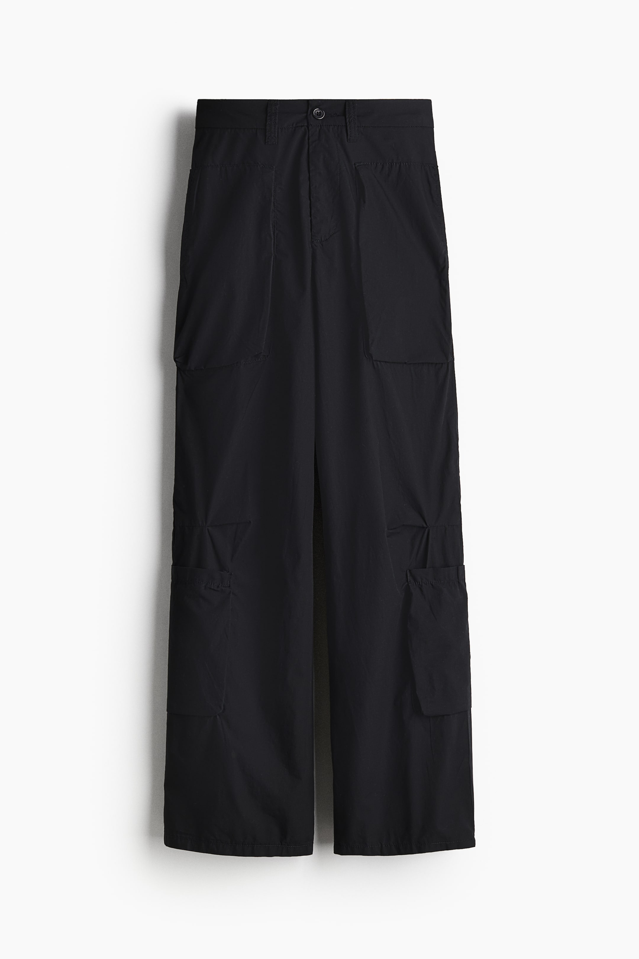 Cargo trousers in a soft cotton weave with patch front and leg pockets. High waist with a zip fly and button and straight legs with a pleat at the knees to create added volume.