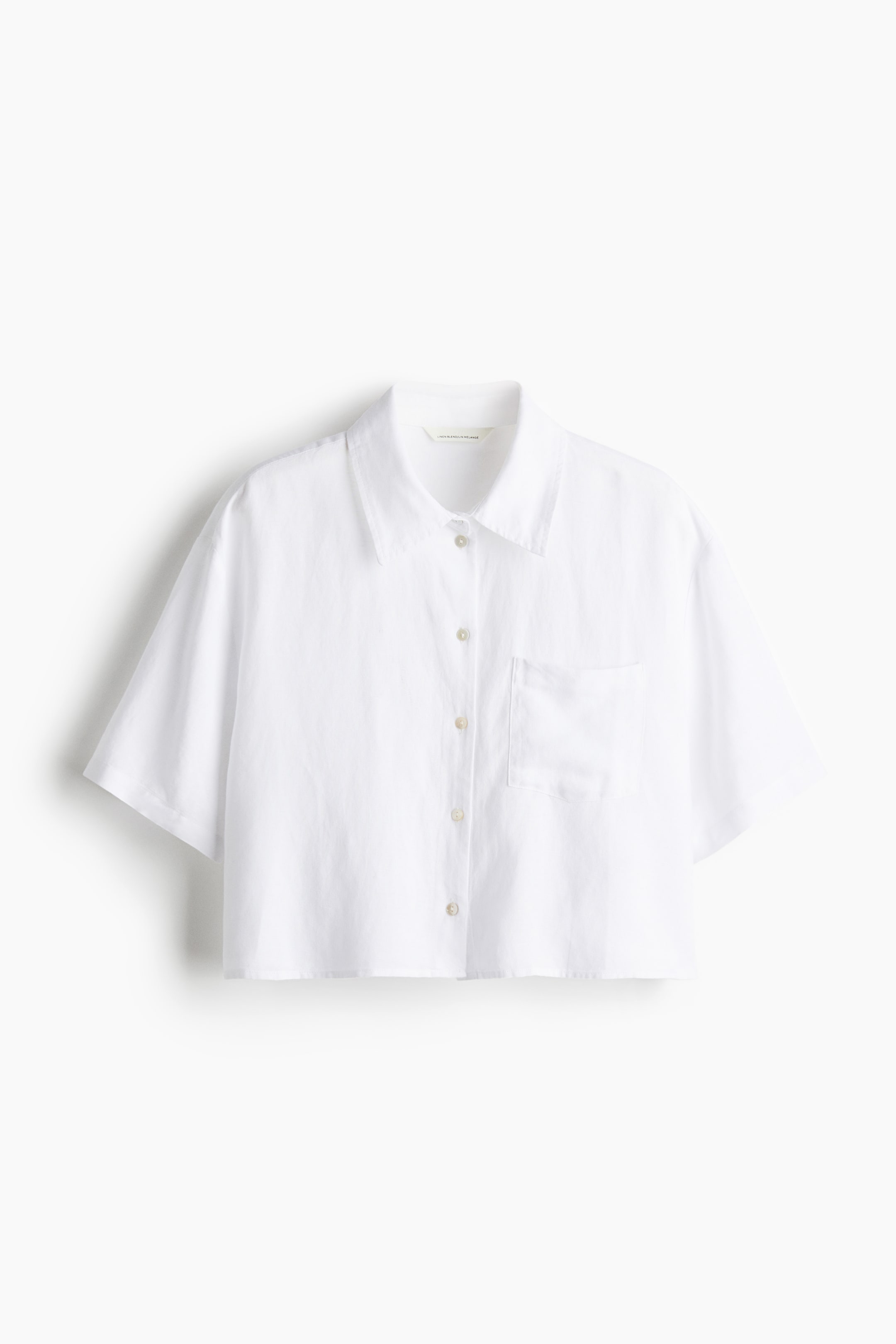 Cropped shirt in an airy weave made from a linen and viscose blend. Loose fit with a collar, buttons down the front and a double-layered yoke with a box pleat at the back. Patch chest pocket, dropped shoulders and short sleeves.