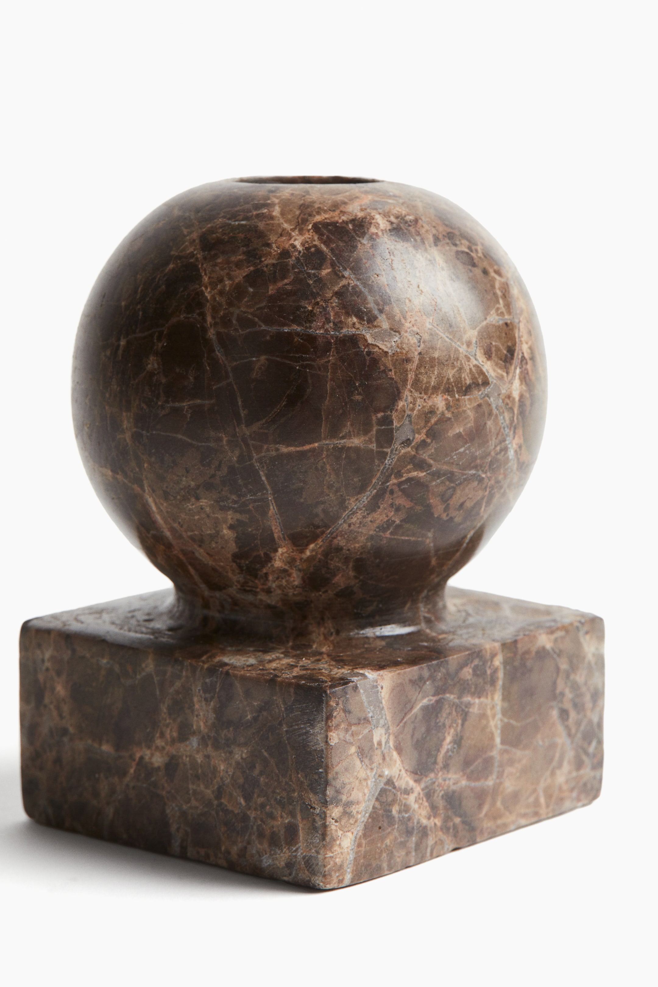 Marble candlestick in the shape of a globe placed on a cube-shaped base. The natural material and geometric shapes create an intriguing combination that suits both modern and rustic living spaces. As marble is a natural material, the colour and texture of each product may vary. Width and depth base 6 cm. Diameter globe 7 cm. Total height 9.5 cm.