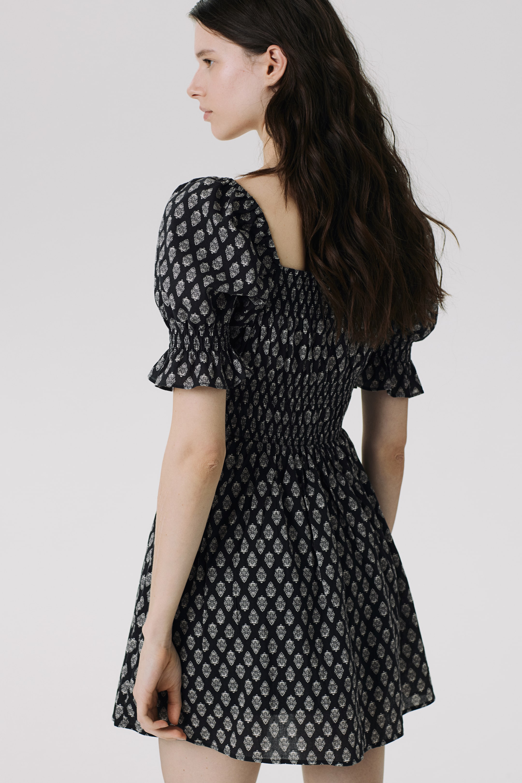 Short, flared-skirt dress in a cotton crêpe weave featuring a fitted bodice with smocked sections. Square, elasticated neckline with a frill trim at the front. Narrow elastication over the shoulders and short puff sleeves with a smocked section and frill trim at the cuffs. Lined skirt.