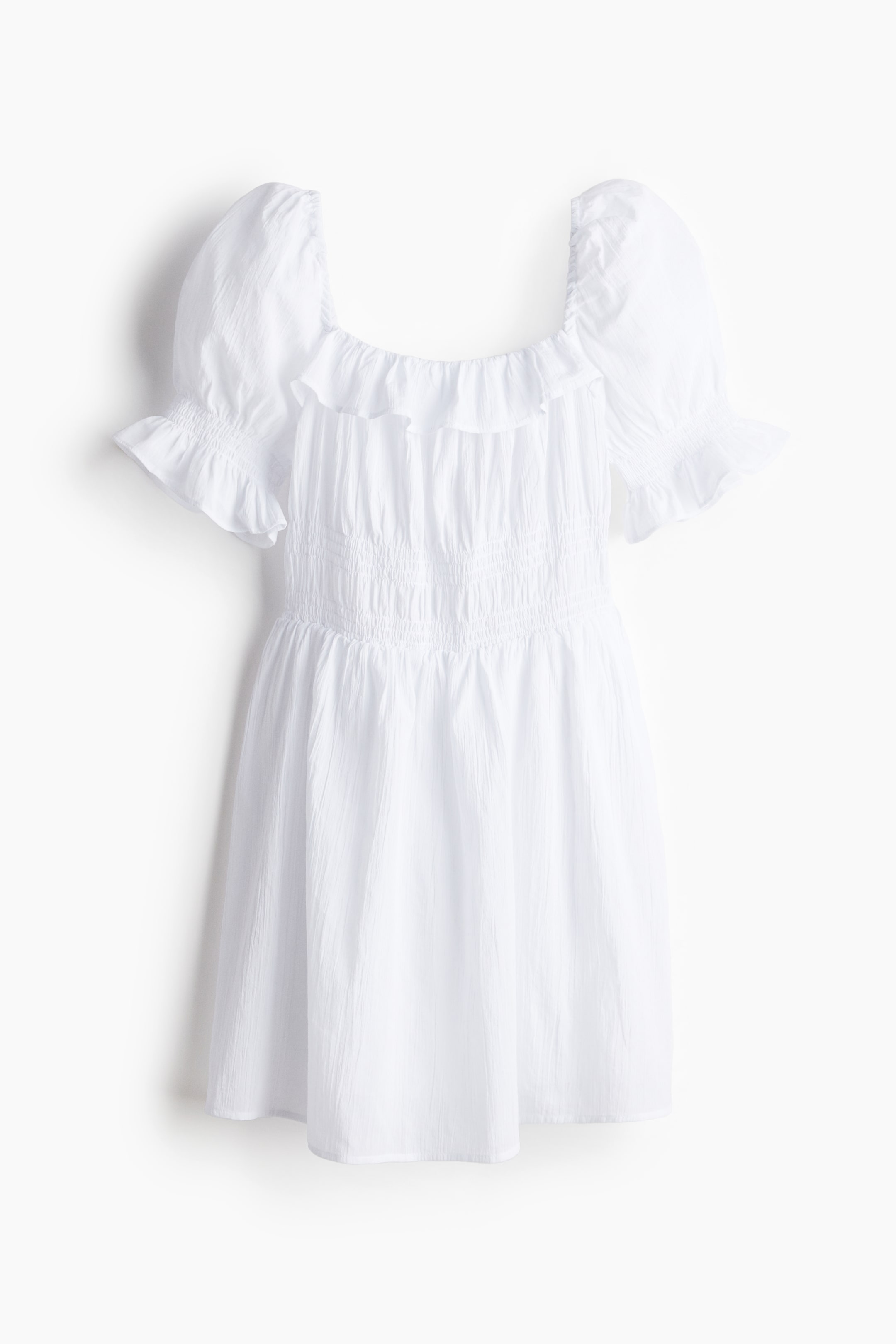 Short, flared-skirt dress in a cotton crêpe weave featuring a fitted bodice with smocked sections. Square, elasticated neckline with a frill trim at the front. Narrow elastication over the shoulders and short puff sleeves with a smocked section and frill trim at the cuffs. Lined skirt.